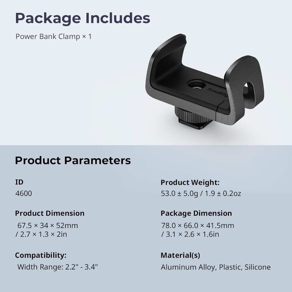 Smallrig Power Bank Holder with Cold Shoe Mount, Power Bank Clamp Mount, Adjustable Power Bank Clamp for Camera rig and Phone Cage 4600