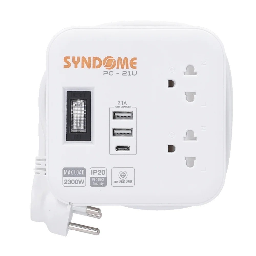 SYNDOME PC-21U ปลั๊กไฟรุ่นใหม่ รองรับกระแสไฟ 10 แอมป์ (2 ช่อง + 2 USB + 1 Type-C / ยาว 1 เมตร) ประกัน Syndome ตลอดชีพ