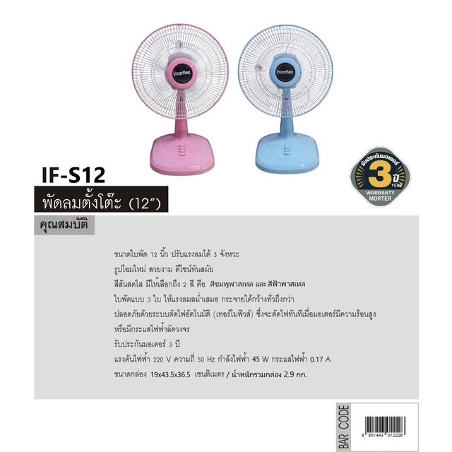 IMARFLEX พัดลมตั้งโต๊ะ 12 นิ้ว 3 ใบพัด สีพาสเทล รุ่น IF-S12 รุ่นใหม่ รับประกันมอเตอร์3ปี