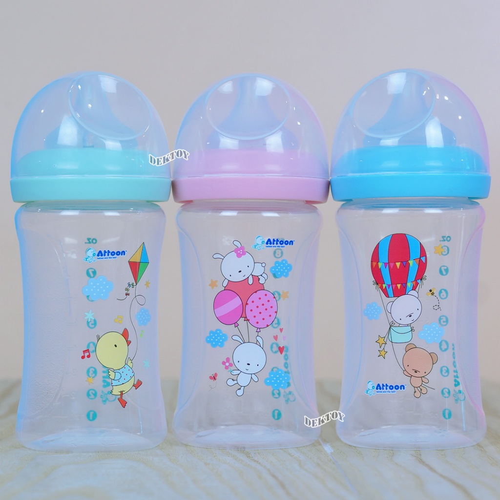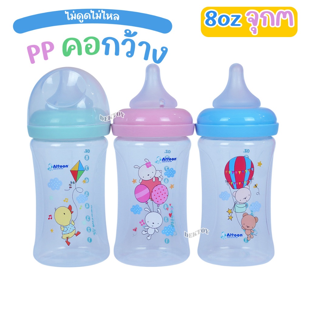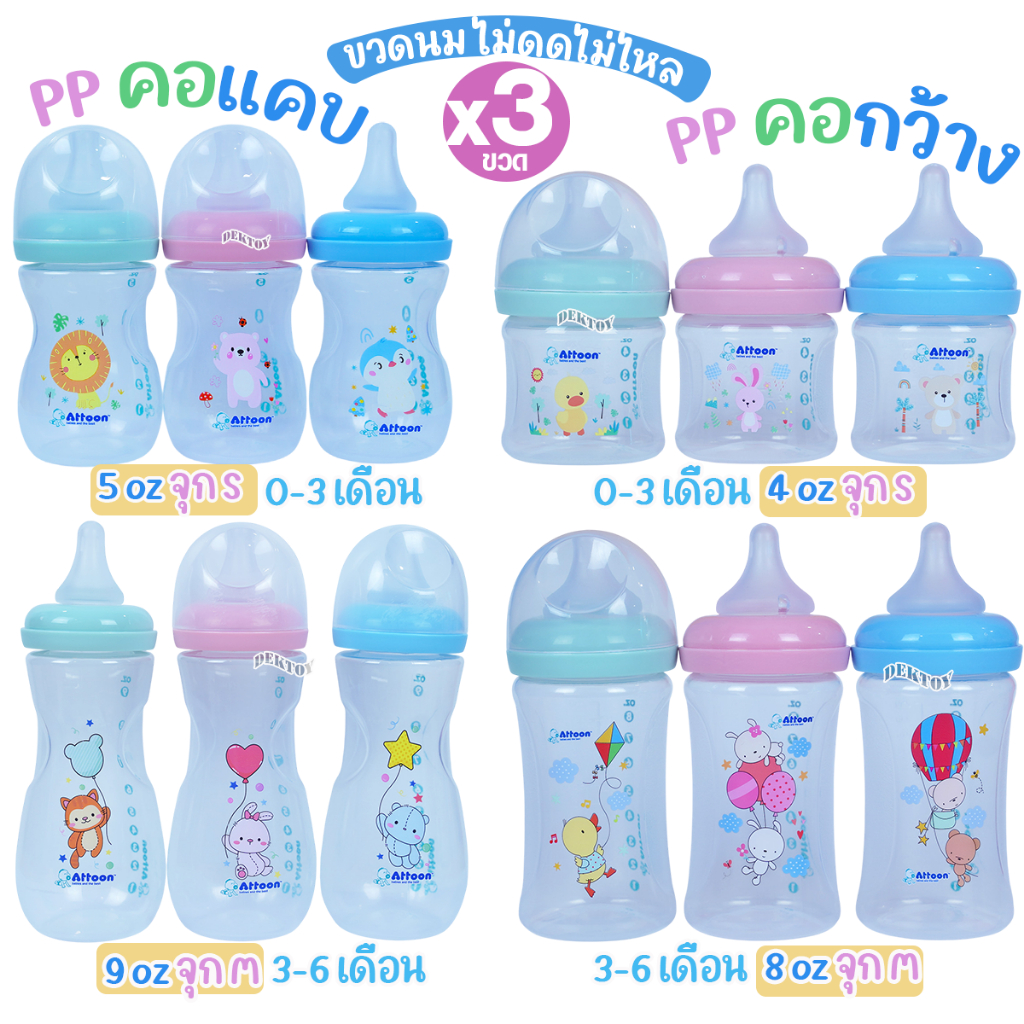 แพ็ค3ขวด Attoon ขวดนมแอทตูน คอแคบ,คอกว้าง พร้อมจุก Antichoke ไม่ดูดไม่ไหล 4/5ออนซ์ 8/9ออนซ์