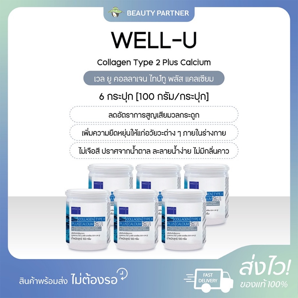 WELL-U Collagen Type 2 Plus Calcium เวล ยู คอลลาเจน ไทป์ทู พลัส แคลเซียม [100 กรัม] [6 กระปุก] คอลลาเจน ดูแลกระดูก