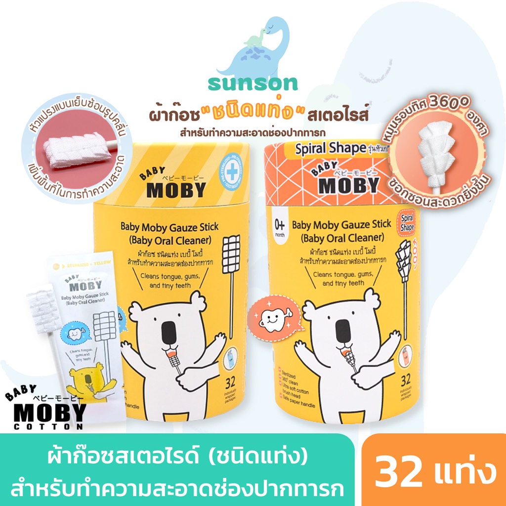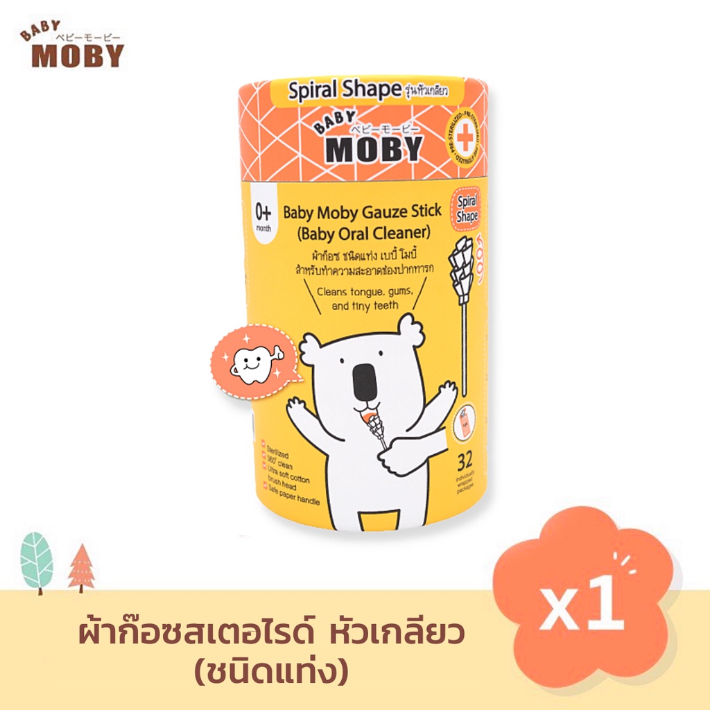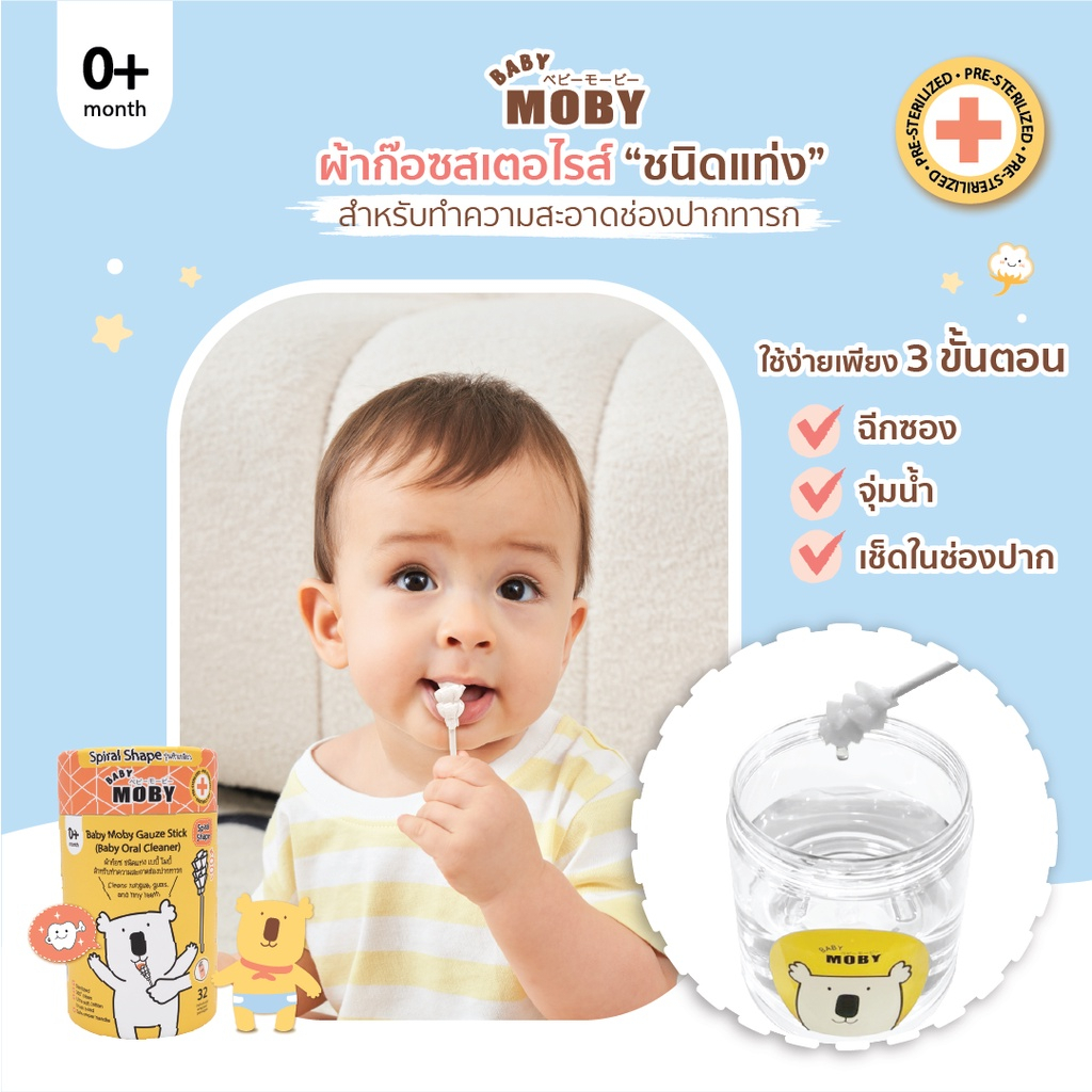 Baby Moby ผ้าก๊อซสเตอไรด์ แบบแท่ง สำหรับเด็ก ทำความสะอาดช่องปาก เช็ดฟัน ลิ้น เหงือก กระพุ้งแก้ม (32 แท่ง / 1กระปุก)