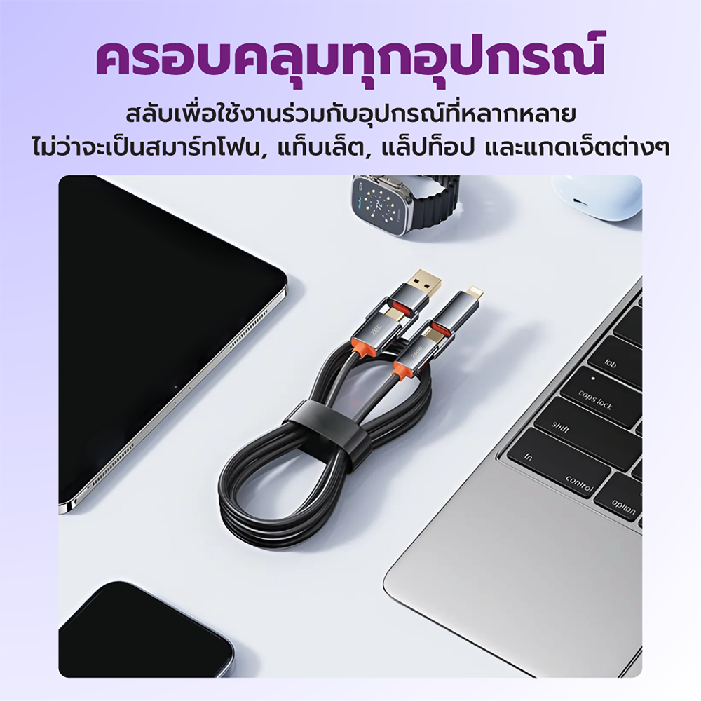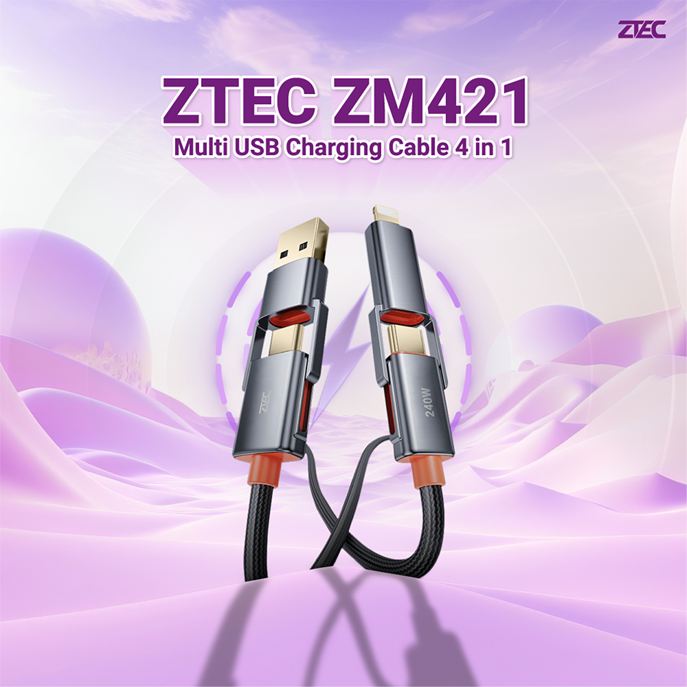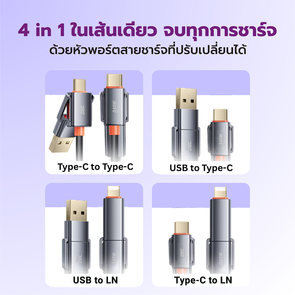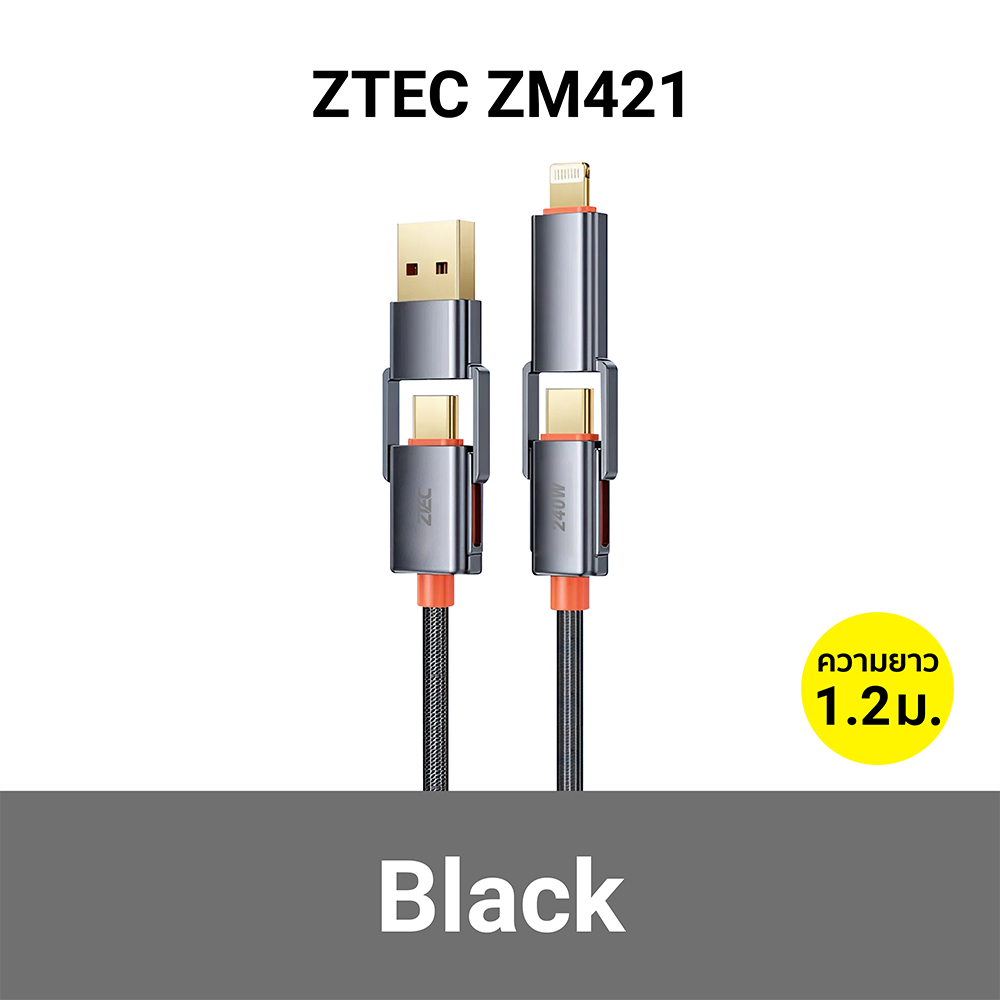 [ลดเหลือ 262] ZTEC ZM421 สายชาร์จ 4 in 1 รองรับชาร์จเร็ว 240W สายถัก หัวพอร์ตอลูมิเนียม แข็งแรงทนทาน -24M