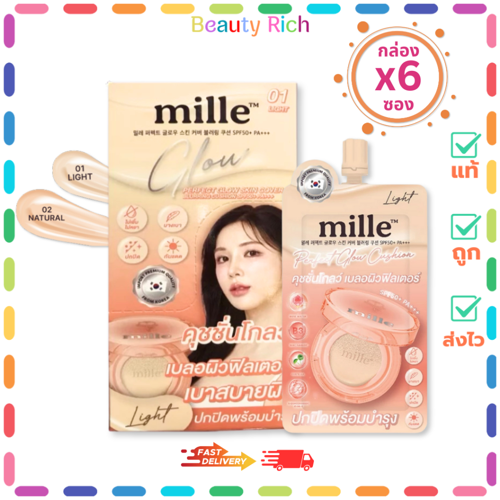 (กล่อง 6 ซอง) Mille Perfect Glow มิลเล่ โกลว์ สกิน คัฟเวอร์ เบลอริ่ง คุชชั่น spf 50+ พีเอ+++ (6 g.)