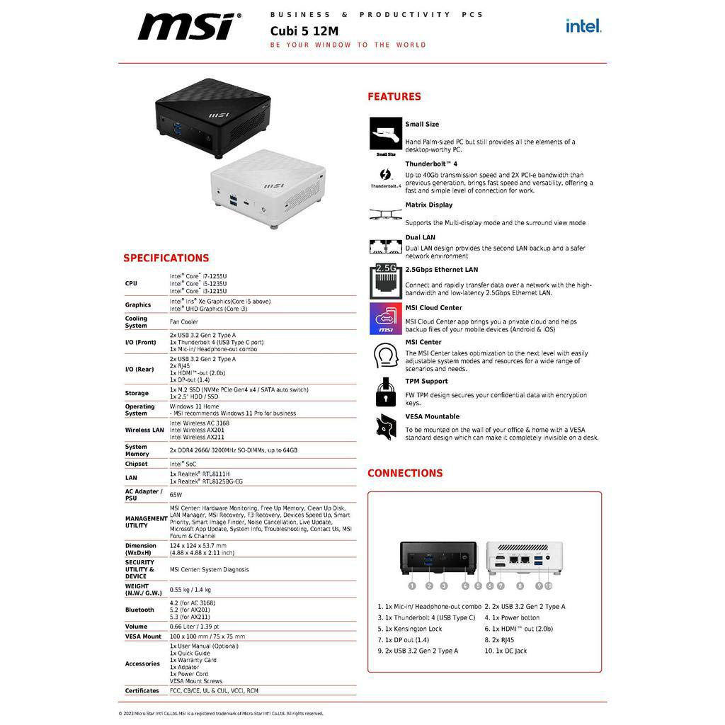 MSI Cubi 5 12M-070TH WHITE (Intel Core i7 1255U / 16GB / 512GB / Win11 Home) ประกันศูนย์ MSI 3 ปี