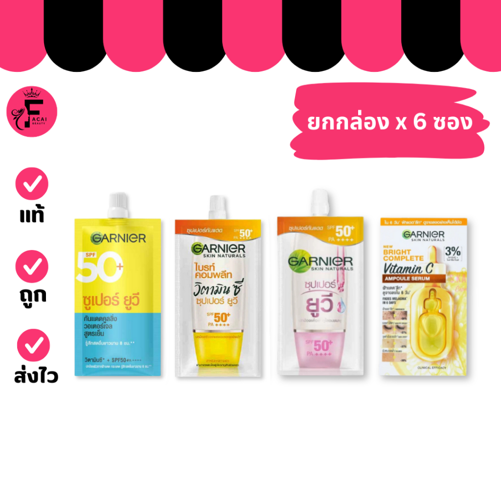 (กล่อง 6 ซอง) Garnier การ์นิเย่แอมพูลเซรั่ม/กันแดดซอง มีให้เลือก 4 สูตร (ปริมาณ 1.5 ml. / 7 ml.)