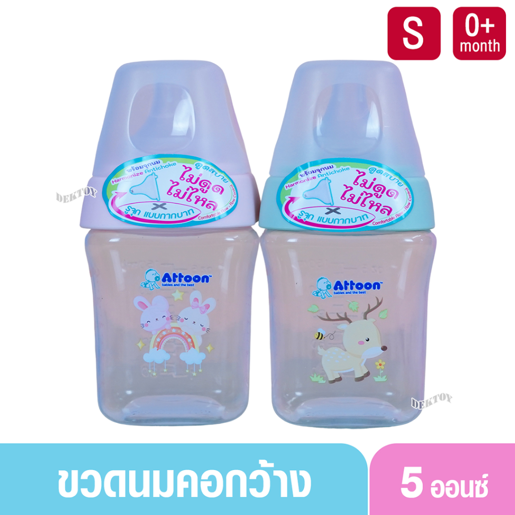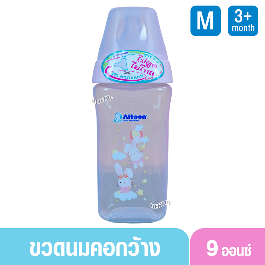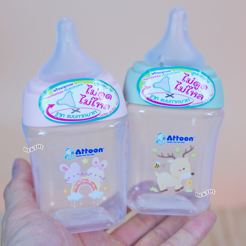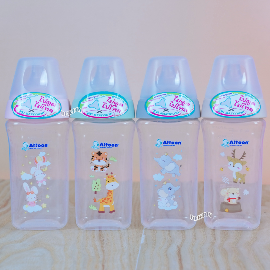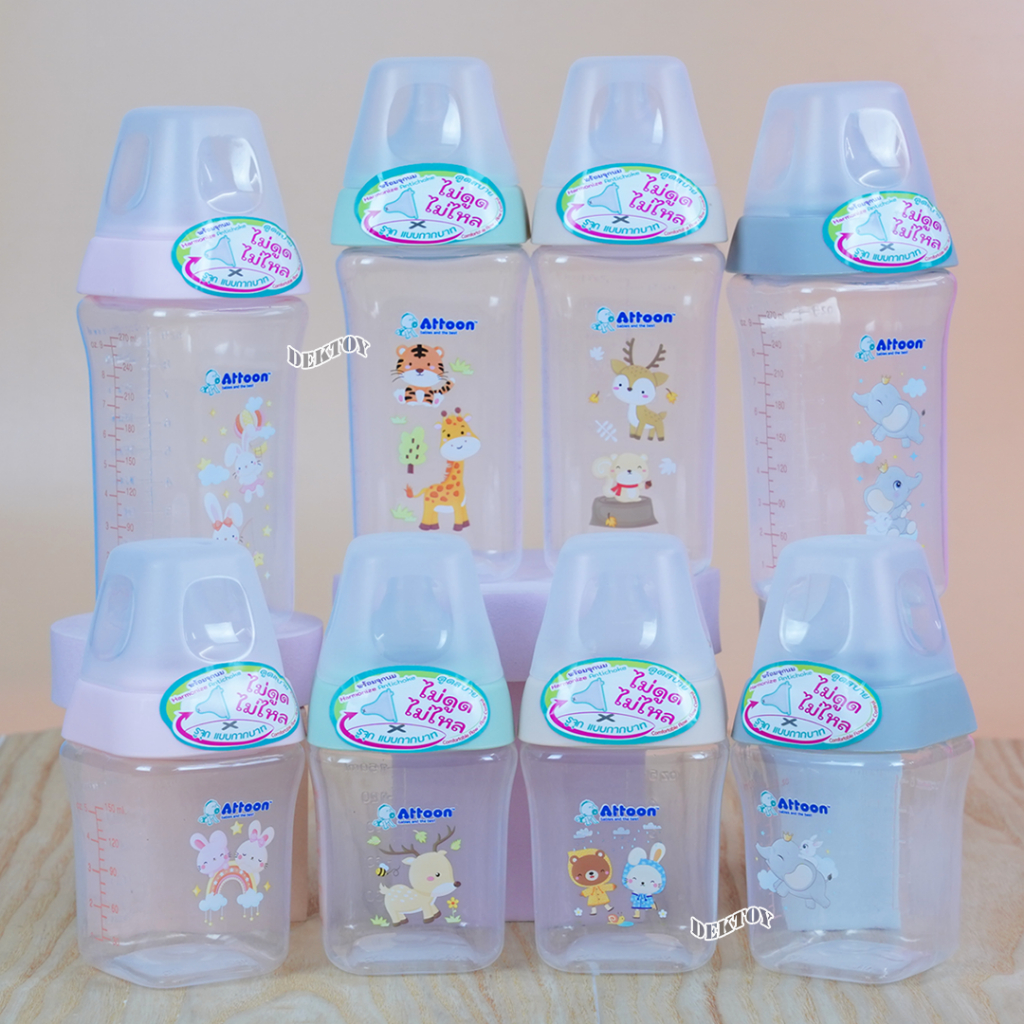 ขวดนมแอทตูน PP ทรงสแควร์ คอแคบ และ คอกว้าง ขนาด 5 และ 9 ออนซ์ มาพร้อมกับจุก หนา นุ่ม ไม่ดูดไม่ไหล