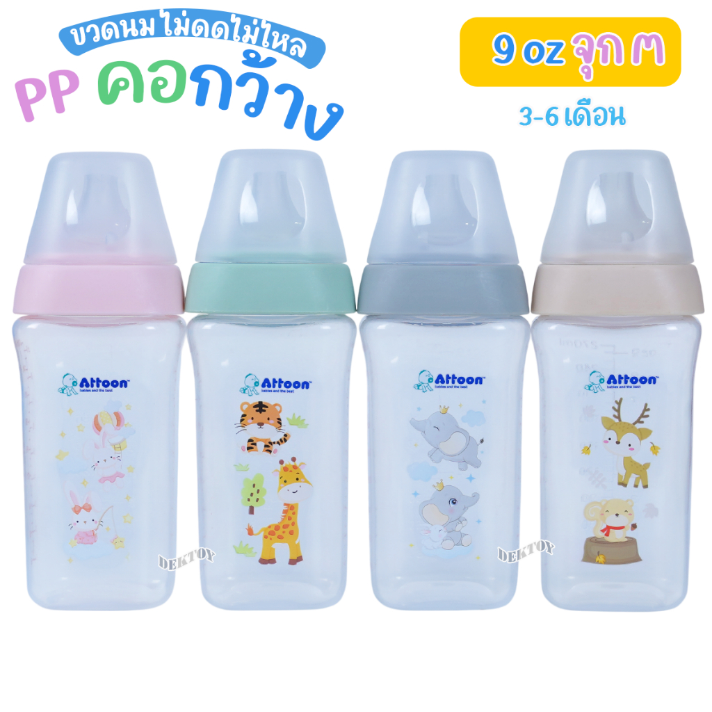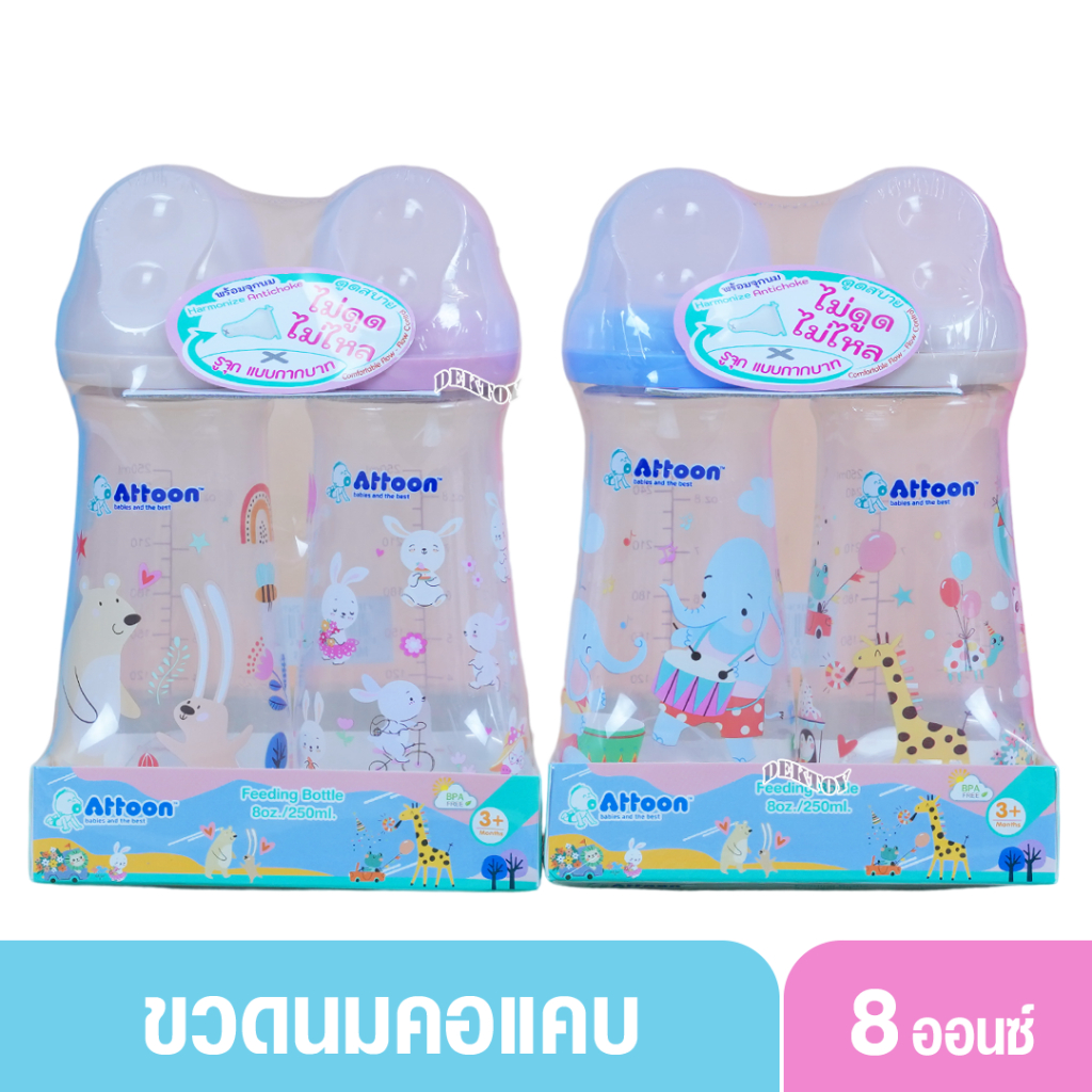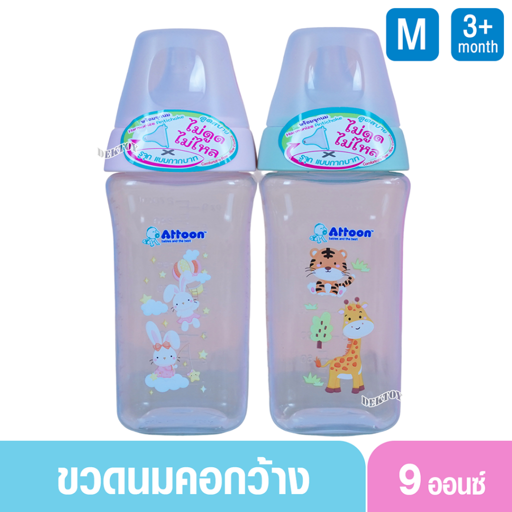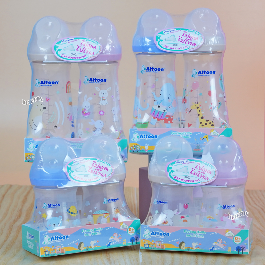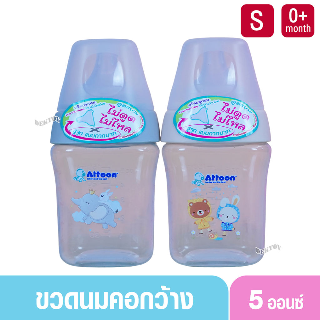 ขวดนมแอทตูน PP ทรงสแควร์ คอแคบ และ คอกว้าง ขนาด 5 และ 9 ออนซ์ มาพร้อมกับจุก หนา นุ่ม ไม่ดูดไม่ไหล