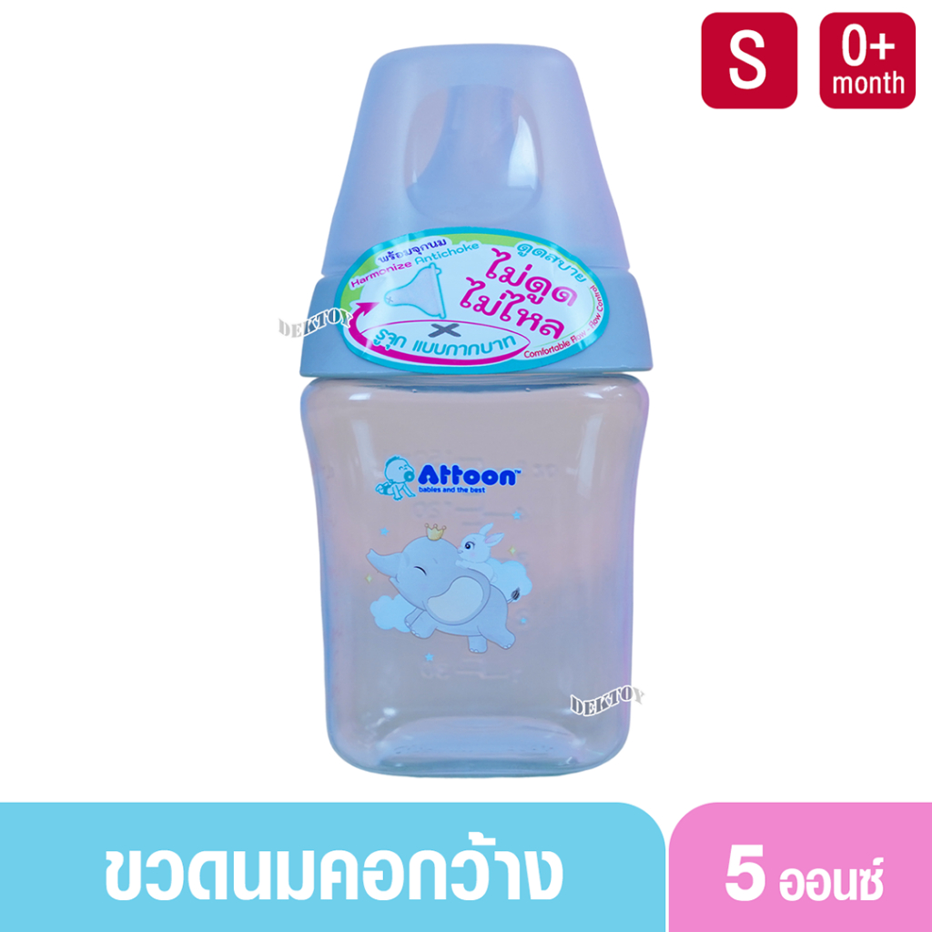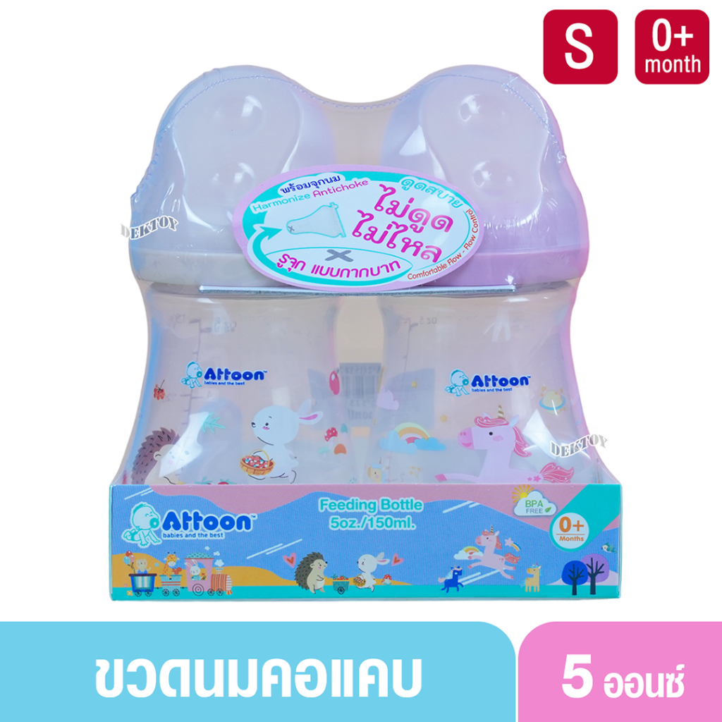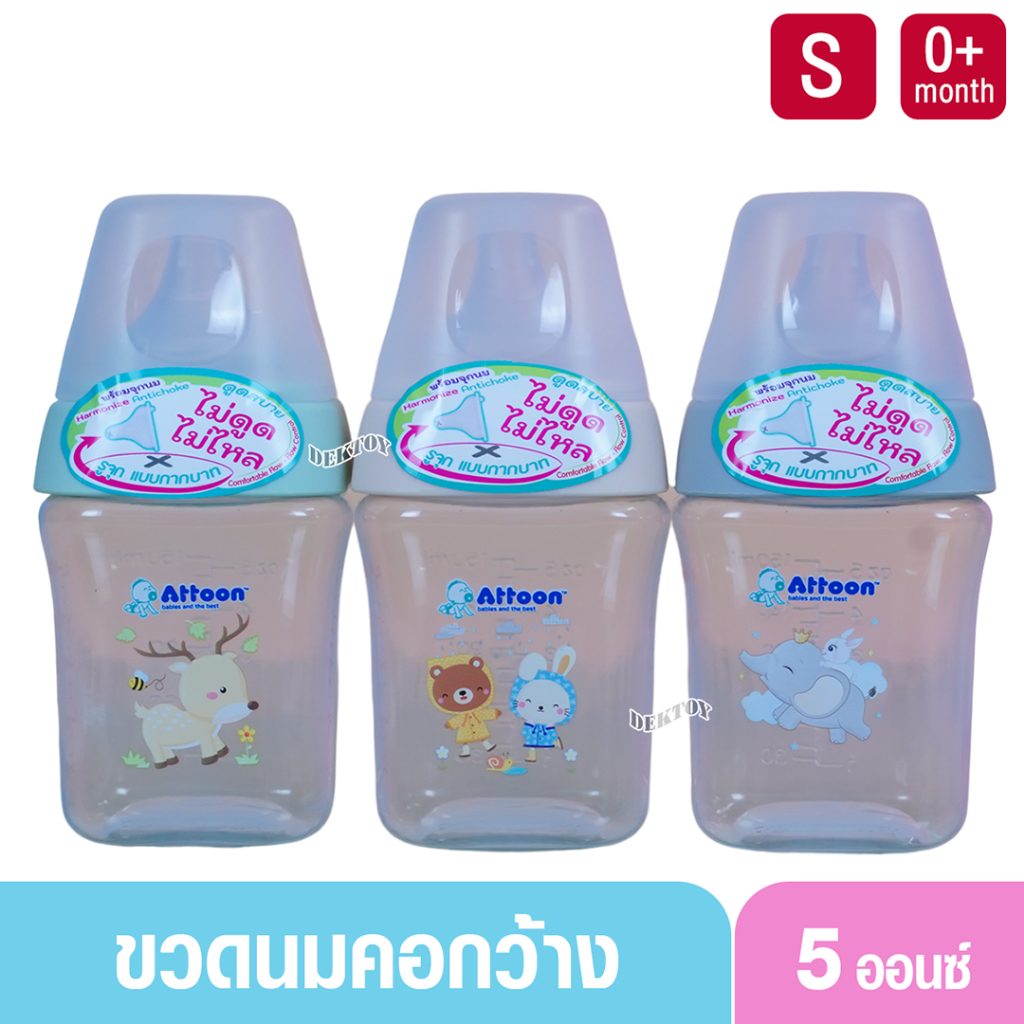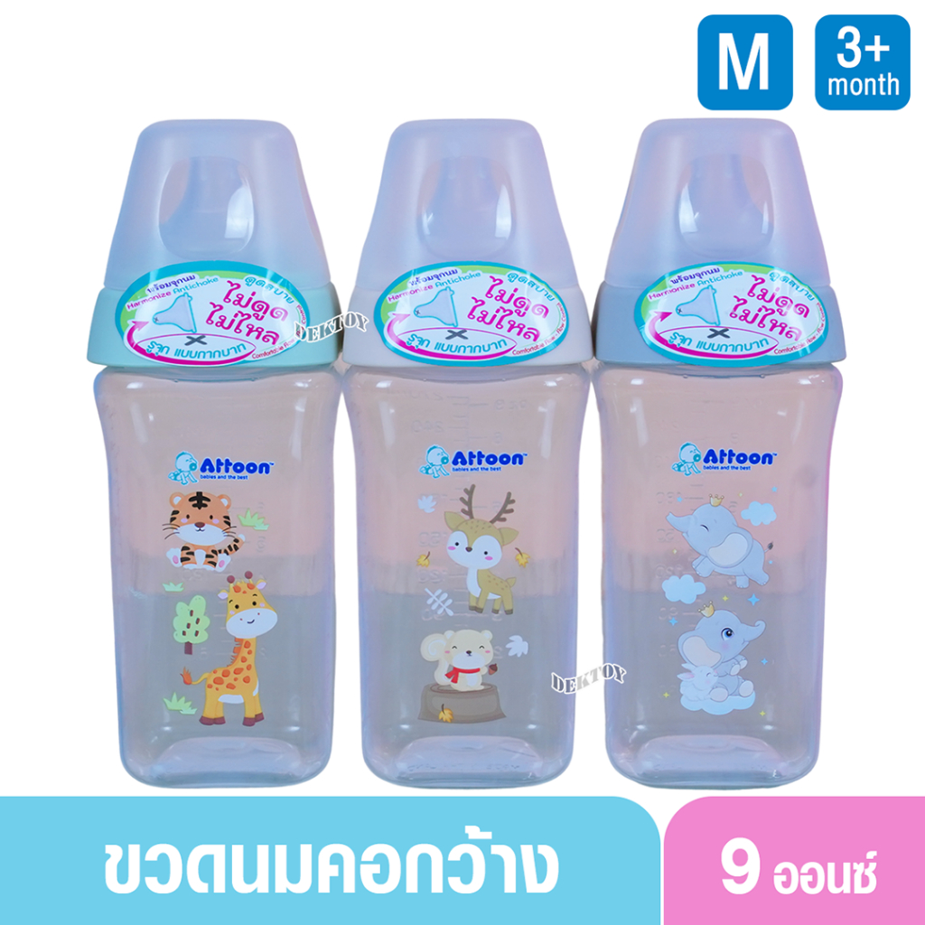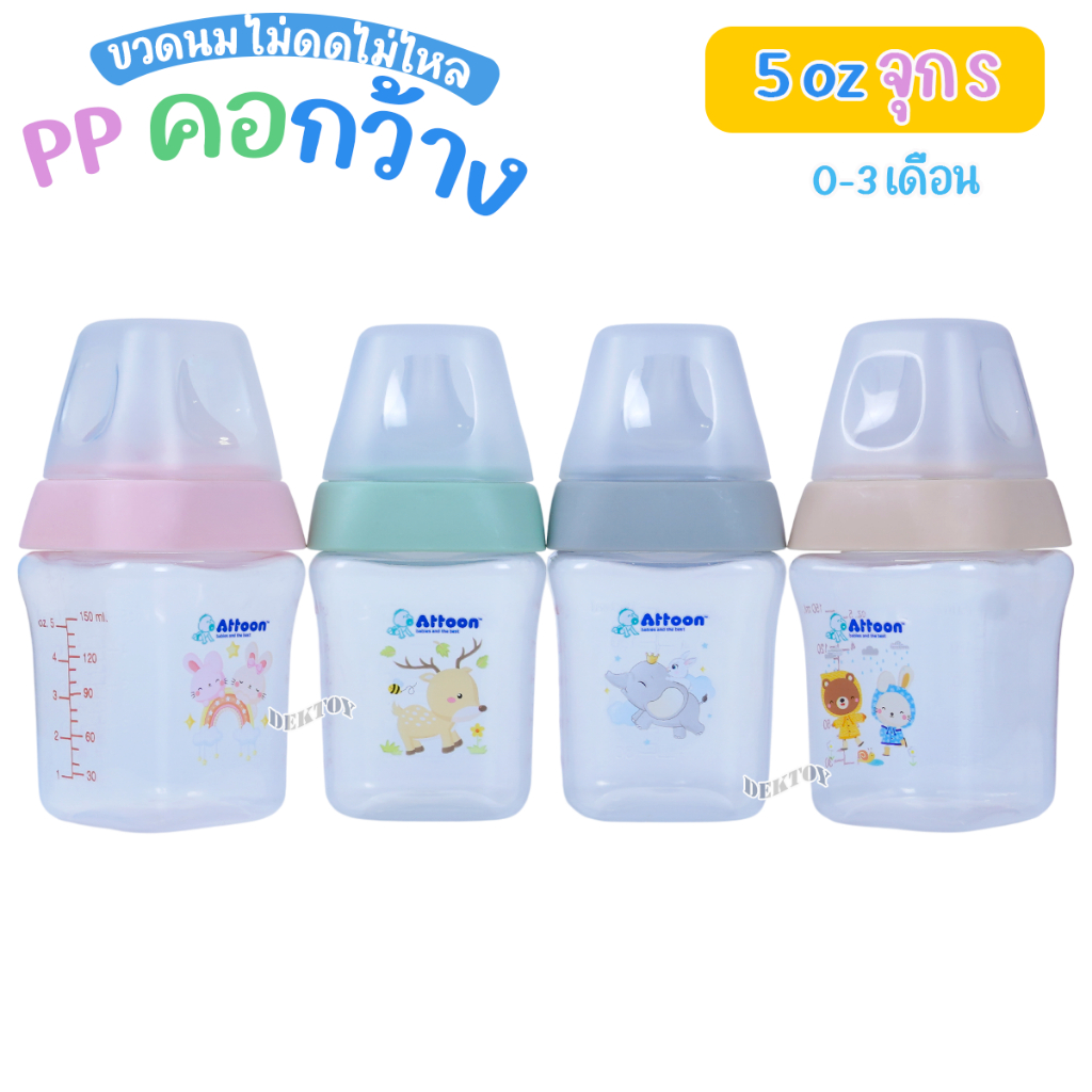 ขวดนมแอทตูน PP ทรงสแควร์ คอแคบ และ คอกว้าง ขนาด 5 และ 9 ออนซ์ มาพร้อมกับจุก หนา นุ่ม ไม่ดูดไม่ไหล