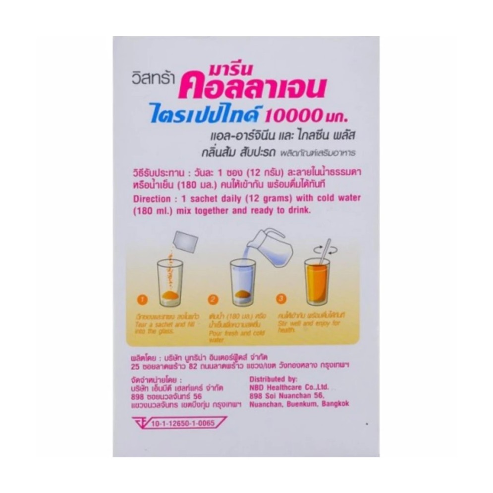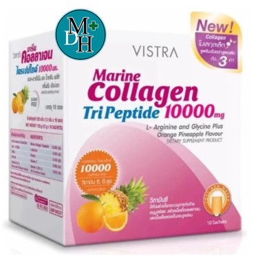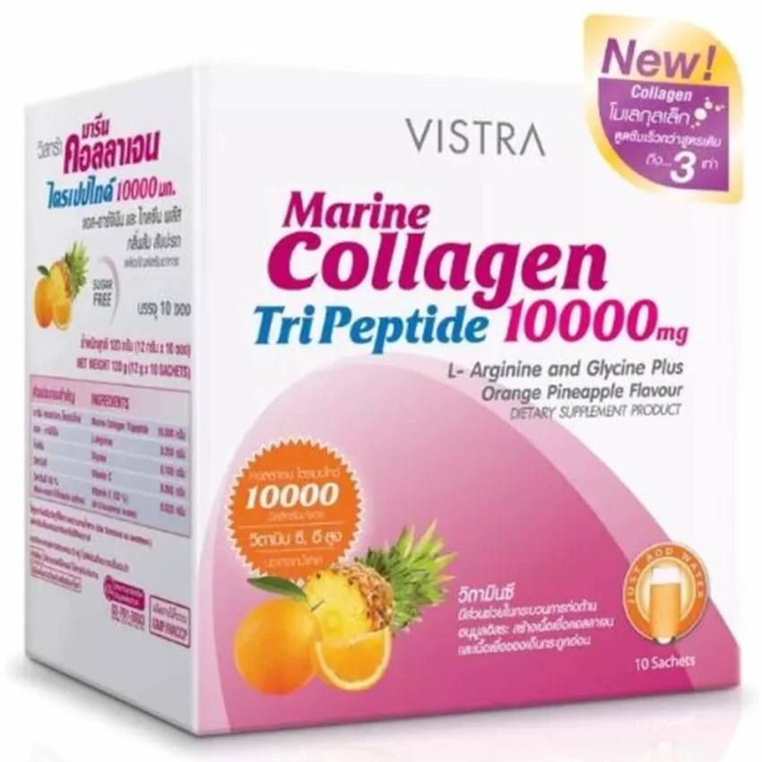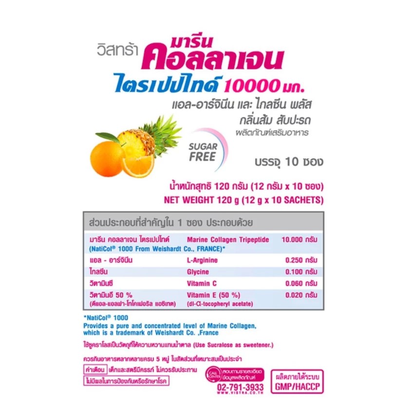 Vistra Collagen Tripeptide 10000 MG วิสทร้า มารีน คอลลาเจน ชนิดผง บำรุงผิว กลิ่นส้ม สับปะรด 1 กล่อง บรรจุ 10 ซอง 09295