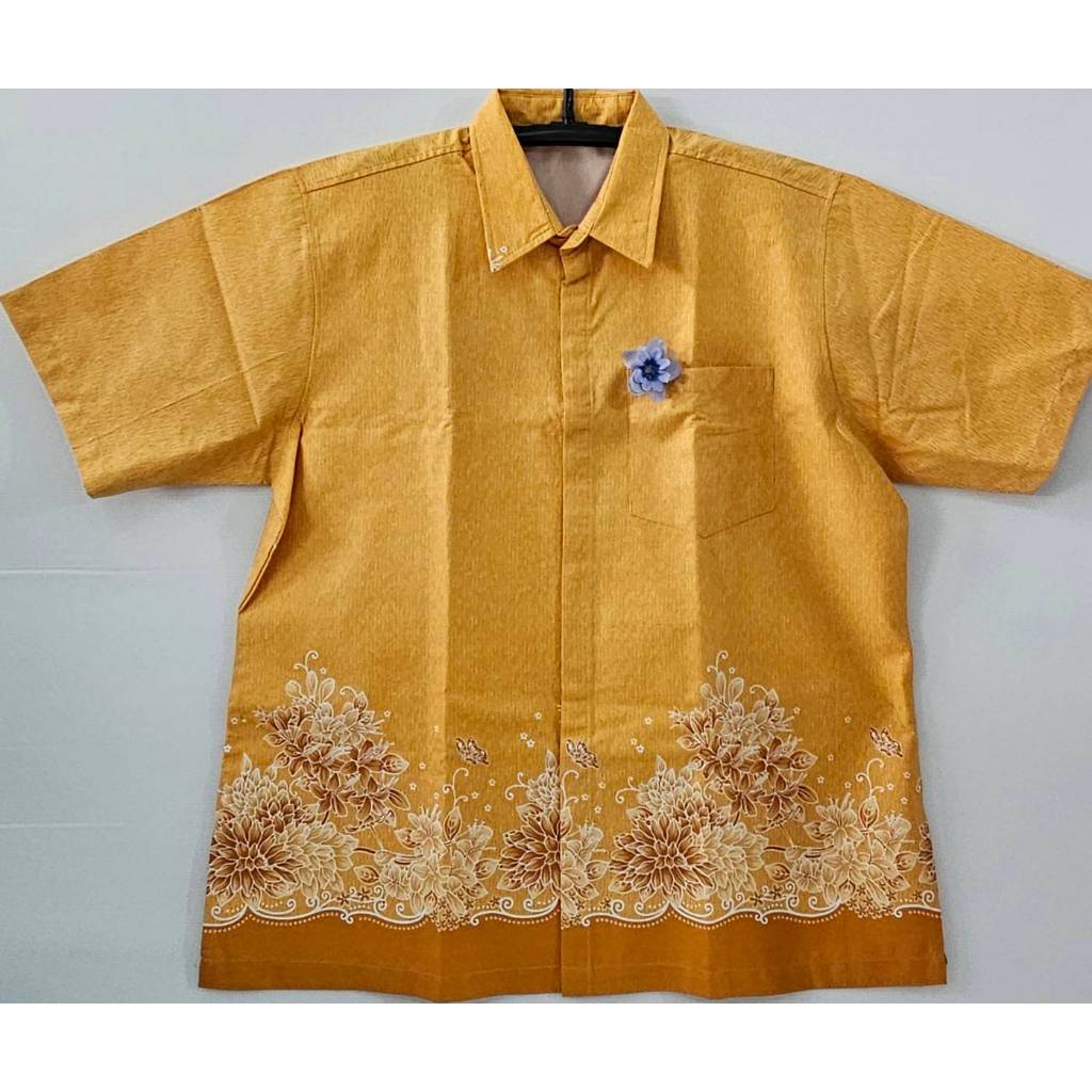 เสื้อเชิ๊ต อัดกาว สีเหลือง ลายบาติส ดอกไม้ ไซส์ใหญ่ อก 54