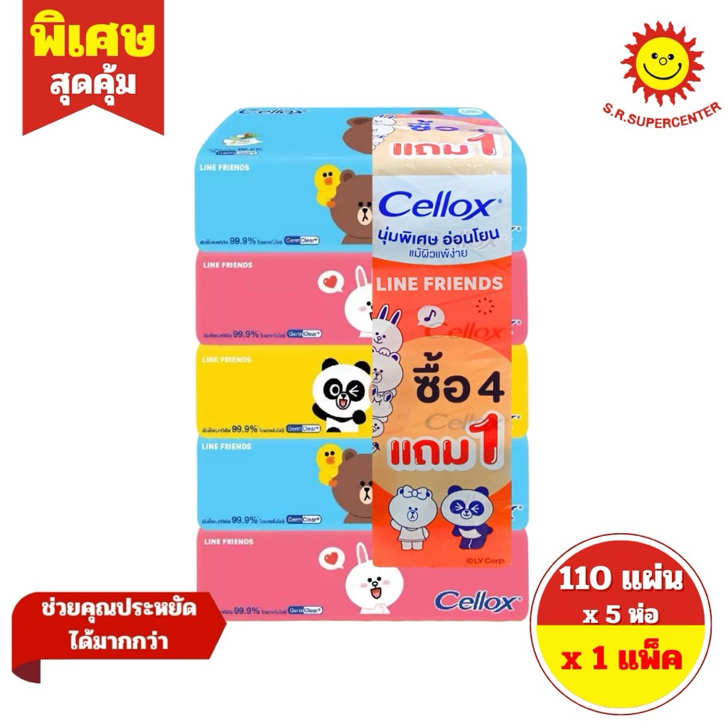 [ 1 แพ็ค ] Cellox เซลล็อกซ์ ซอฟแพค กระดาษเช็ดหน้า ไลน์เฟรนด์ ขนาด 110 แผ่น x 4แถม1
