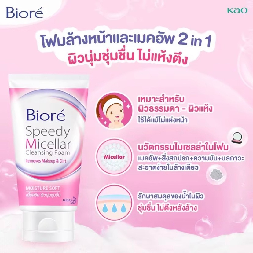 บิโอเร สปีดี้ ไมเซลล่า คลีนซิ่งโฟม สูตรมอยส์เจอร์ ซอฟท์ 90 ก. Biore Speedy Micellar Cleansing Foam 90g.