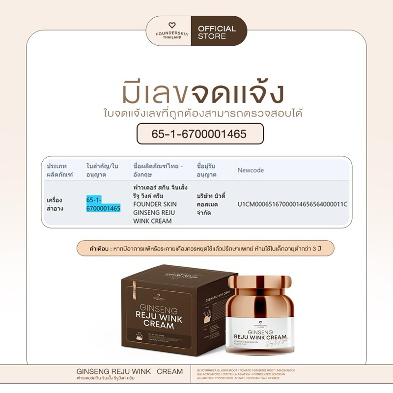 [1 กระปุก]ครีมโสม รีจู วิงค์อัพ ] GingsengReju Wink Cream ฟาวเดอร์สกิน Founderskin ขนาด 15กรัม