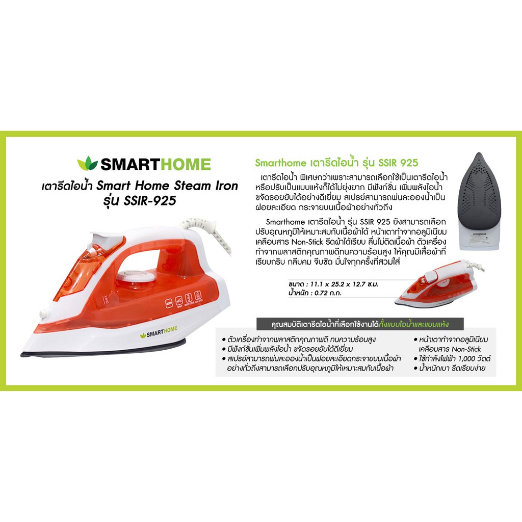 SMARTHOME เตารีดไอน้ำ 1,800 วัตต์ รุ่น SSIR-925 รับประกัน 3 ปี