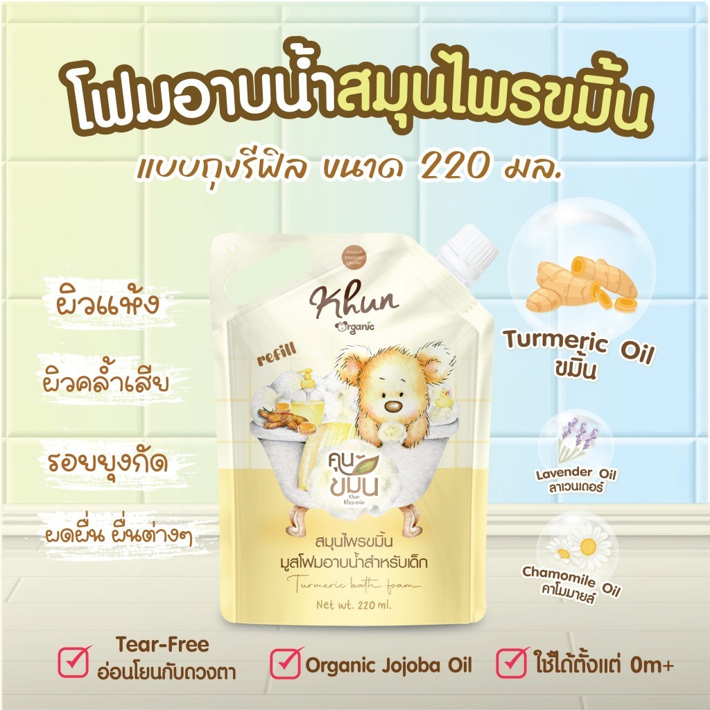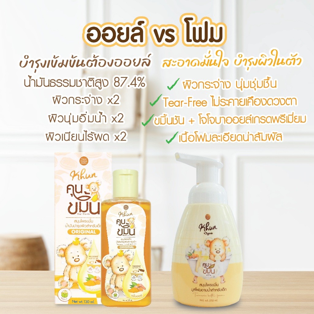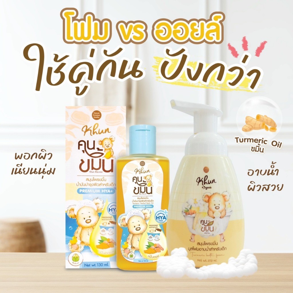 Khun ขมิ้นออยล์ ขมิ้นโฟม อาบน้ำเด็ก สมุนไพรอาบน้ำเด็ก ออร์แกนิค ใช้ง่าย บำรุงผิวชุ่มชื้น ขาวสว่างใส ใช้ได้ตั้งแต่แรกเกิด