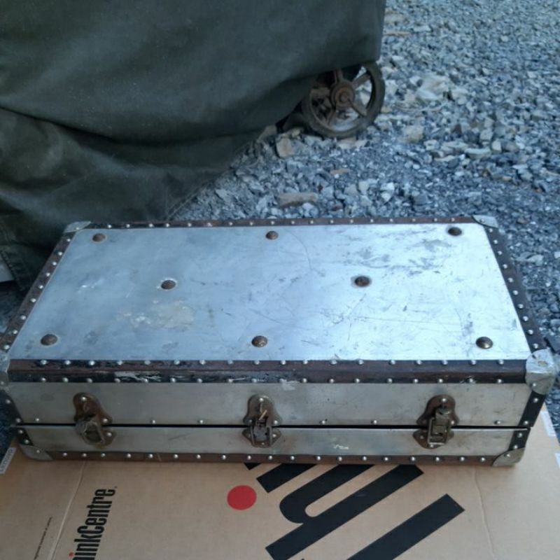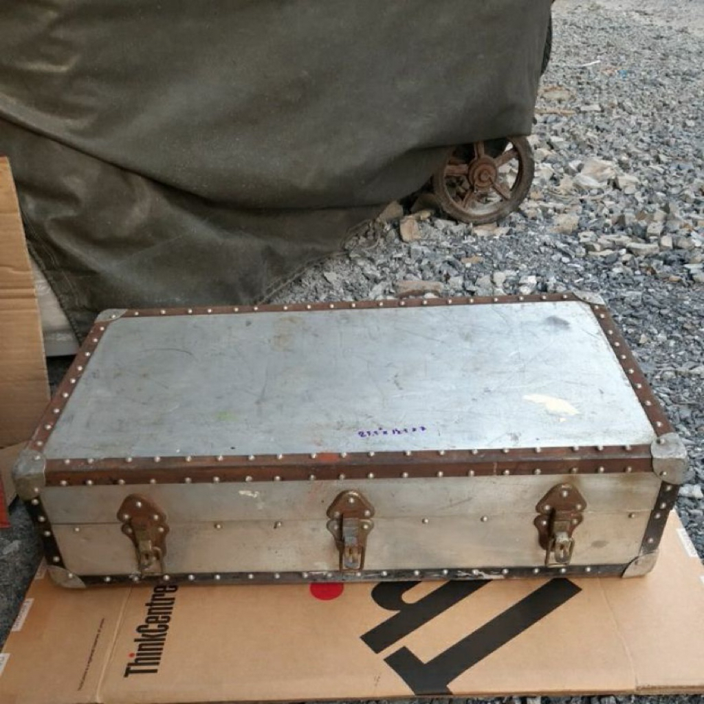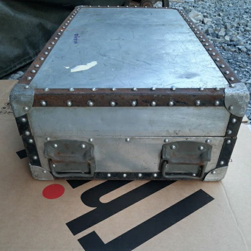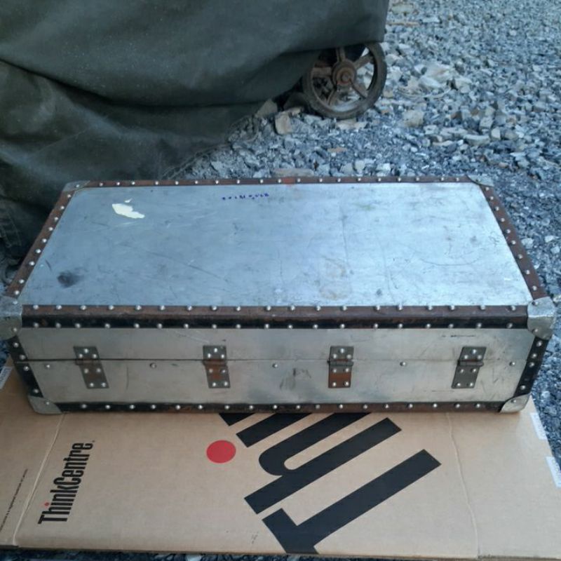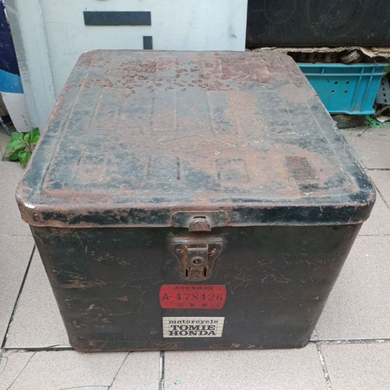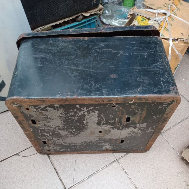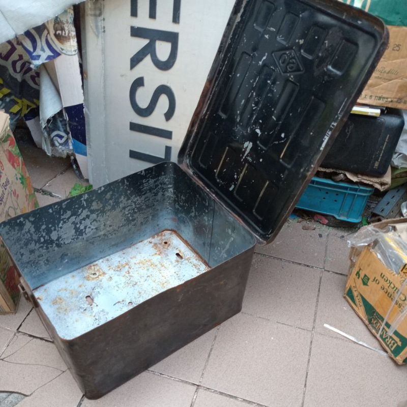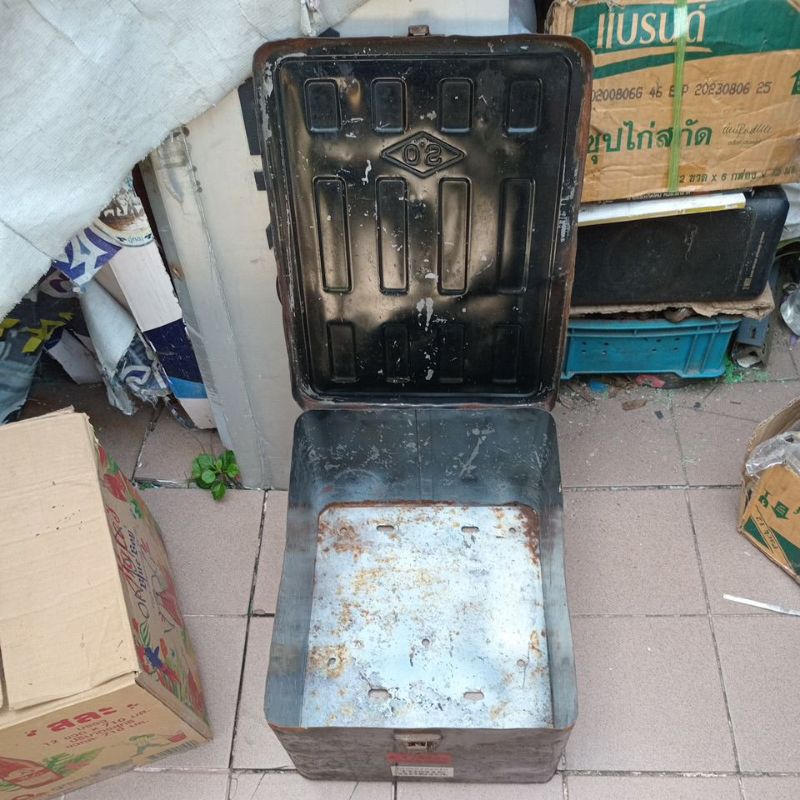 ลังเหล็กมือ2-ลังเหล็กใส่สินค้า ด้านล่างมีรูไว้สำหรับยึด ที่ล็อคกุญแจชำรุด ทำจากเหล็ก ภายในมีตำหนิบาง รอบๆมีรอยคราบสนิม