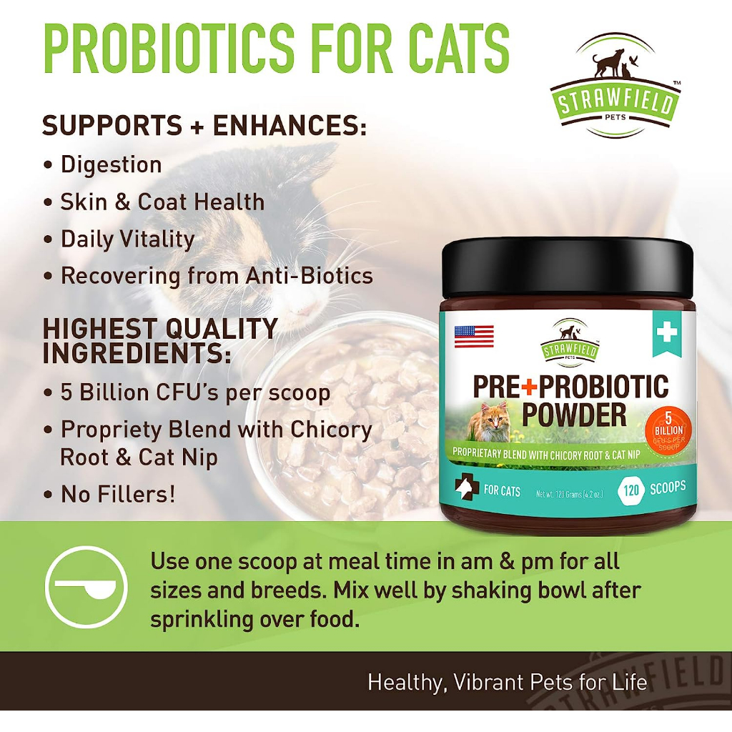 Strawfield Pre + Probiotic Powder for Cats - 5 billion CFU with digestion, immune system function and overall health