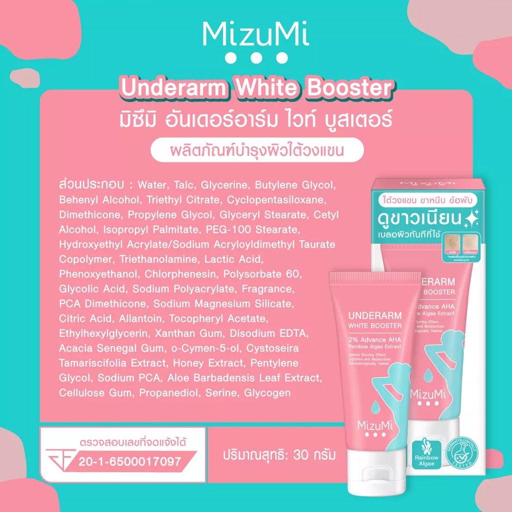ครีมทารักแร้ ขาหนีบ หลังคอ บำรุงผิวกระจ่างใส เรียบเนียน มิซึมิ อันเดอร์อาร์ม 30 กรัม Mizumi Underarm White Booster 30g.