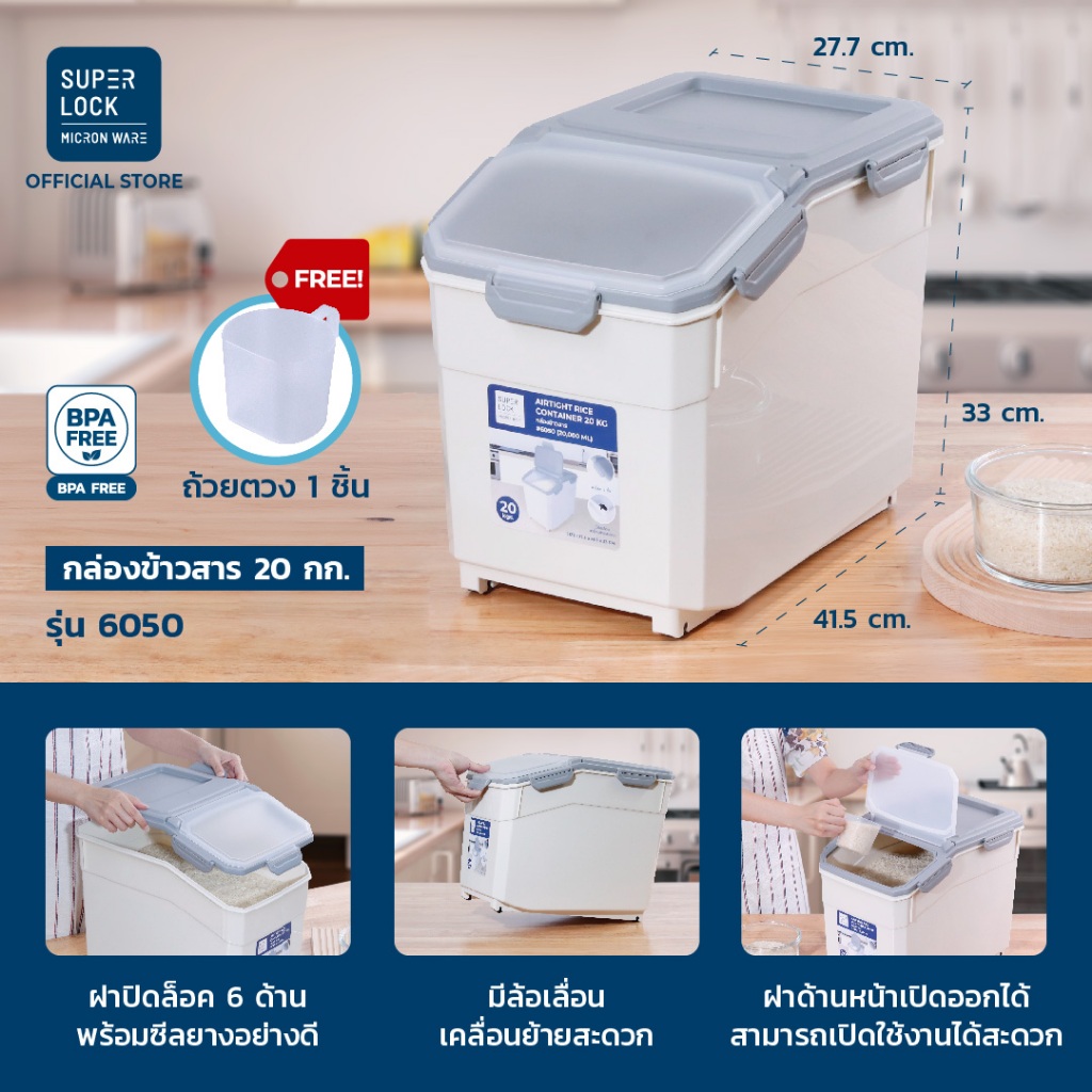 Super Lock กล่องใส่ข้าวสาร ถังข้าวสาร 20 Kg รุ่น 6050 ถังเก็บข้าวสาร อาหารแห้ง มีล้อเลื่อนเคลื่อนย้ายสะดวก ฟรีถ้วยตวง