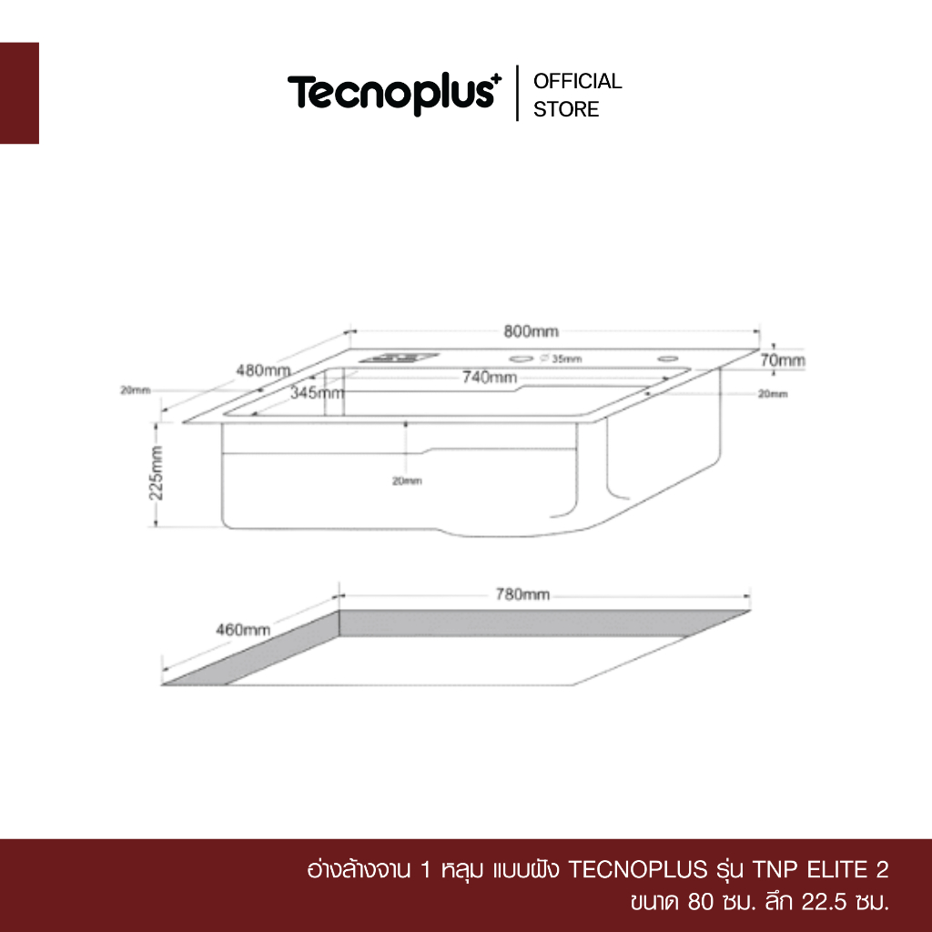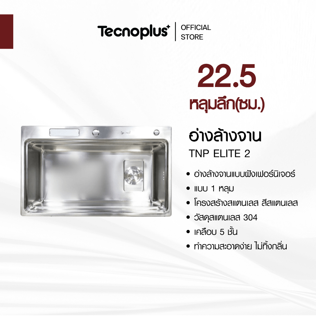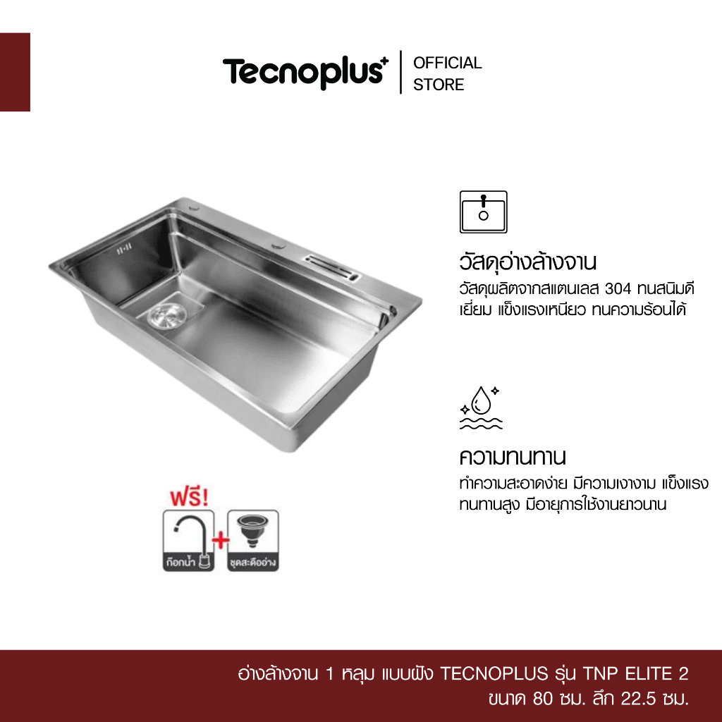 อ่างล้างจาน 1 หลุม แบบฝัง Tecnoplus รุ่น TNP ELITE 2 ขนาด 80 ซม. ลึก 22.5 ซม.