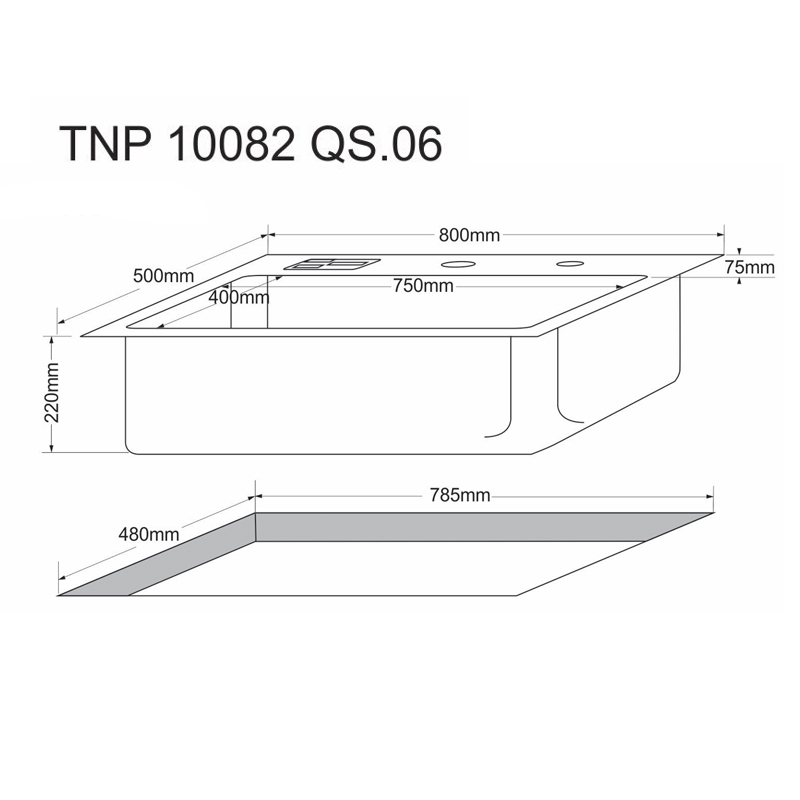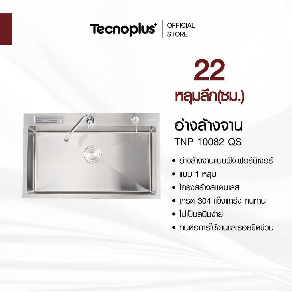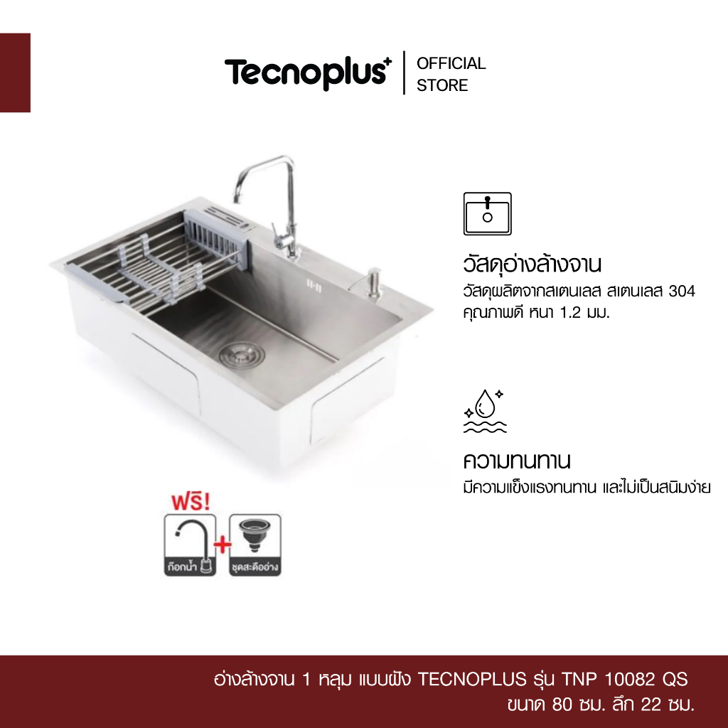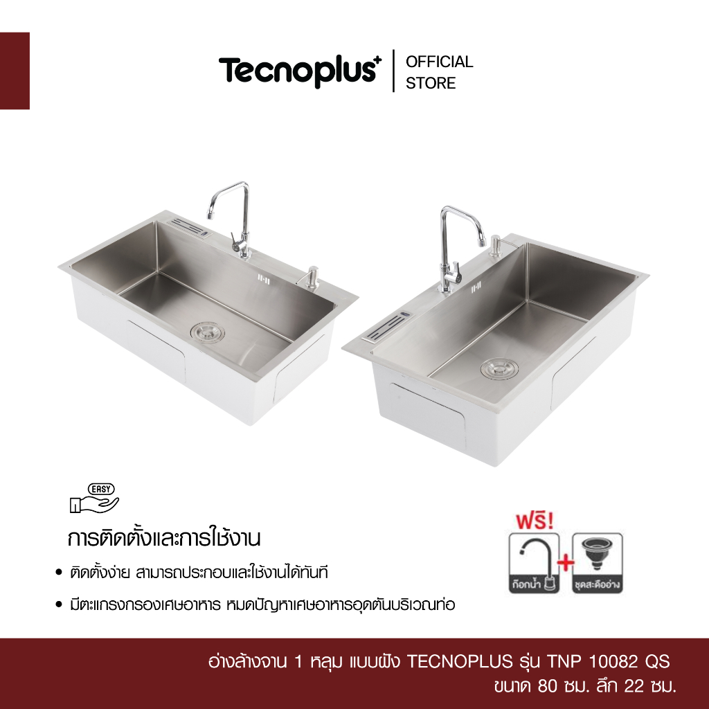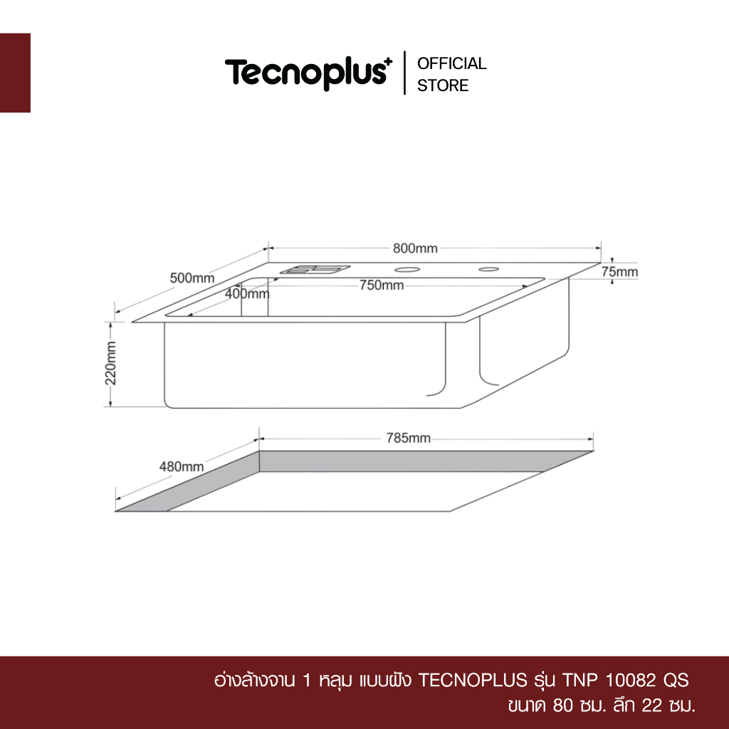 อ่างล้างจาน 1 หลุม แบบฝัง Tecnoplus รุ่น TNP 10082 QS ขนาด 80 ซม. ลึก 22 ซม.