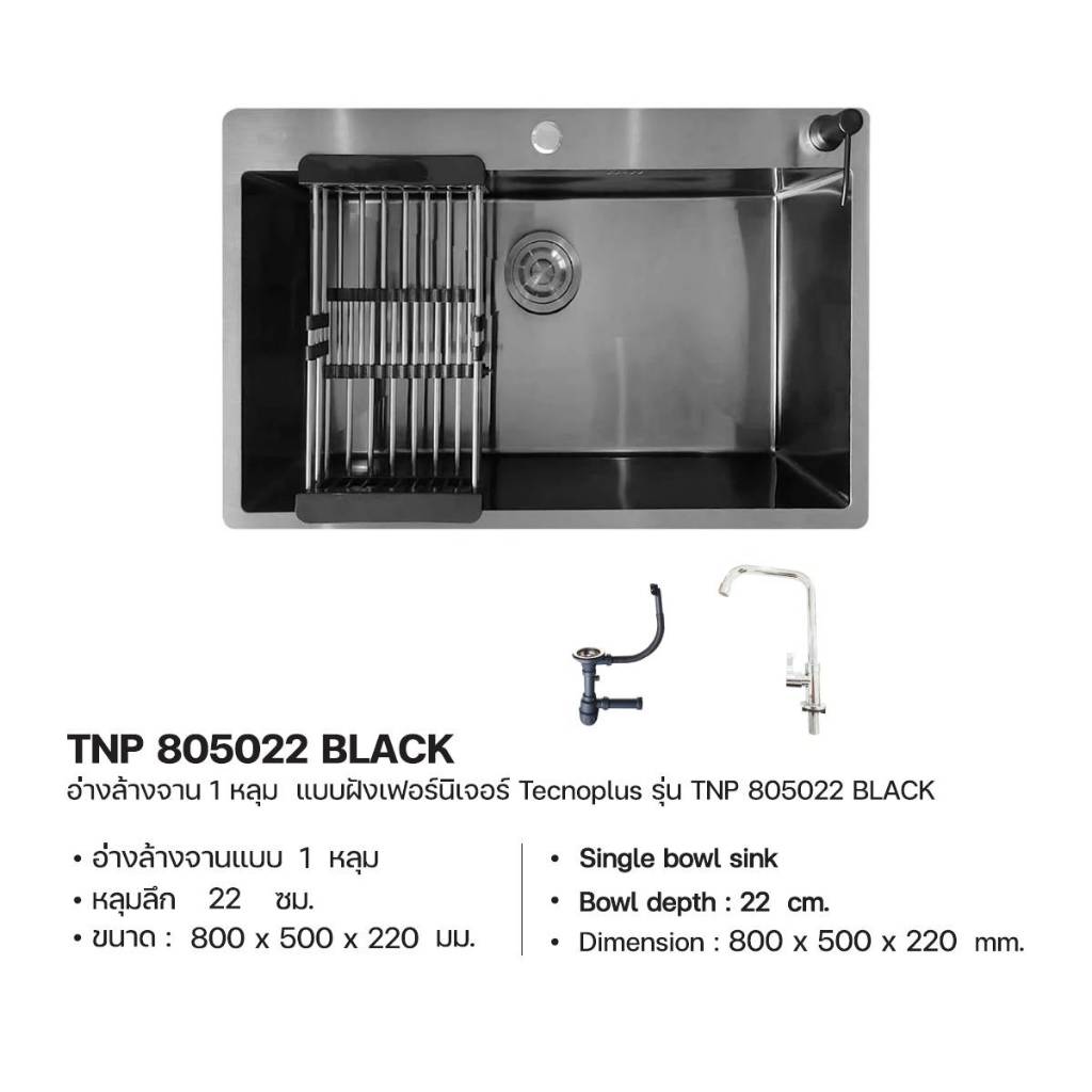 TECNOPLUS อ่างล้างจาน 1 หลุม สีดำ รุ่น TNP 805022 BLACK แถมฟรีก๊อกซิงค์ สีดำ(ยืน) ZI18-BLACK