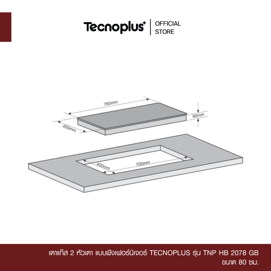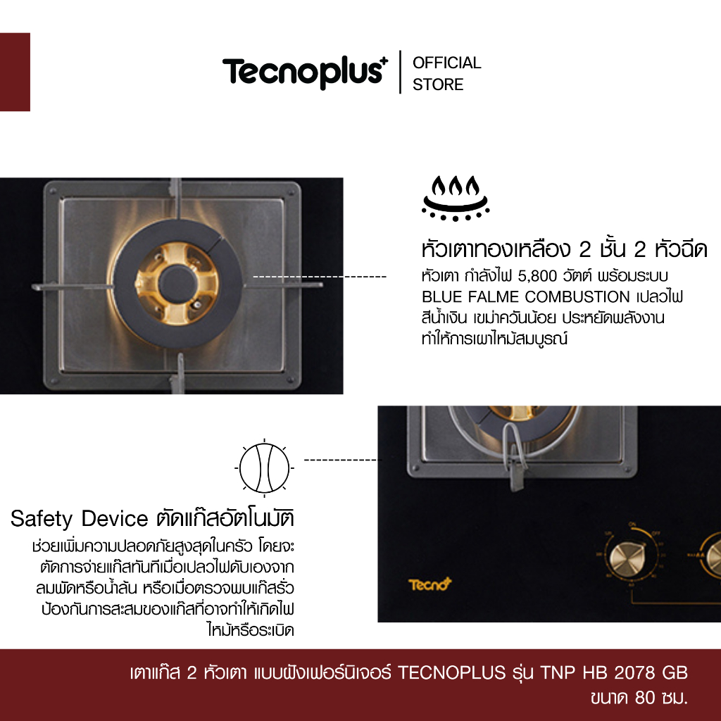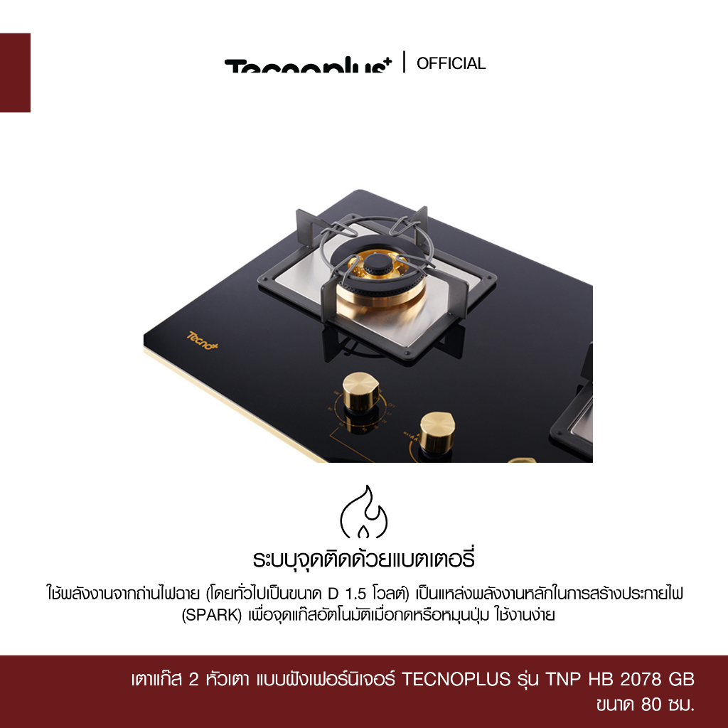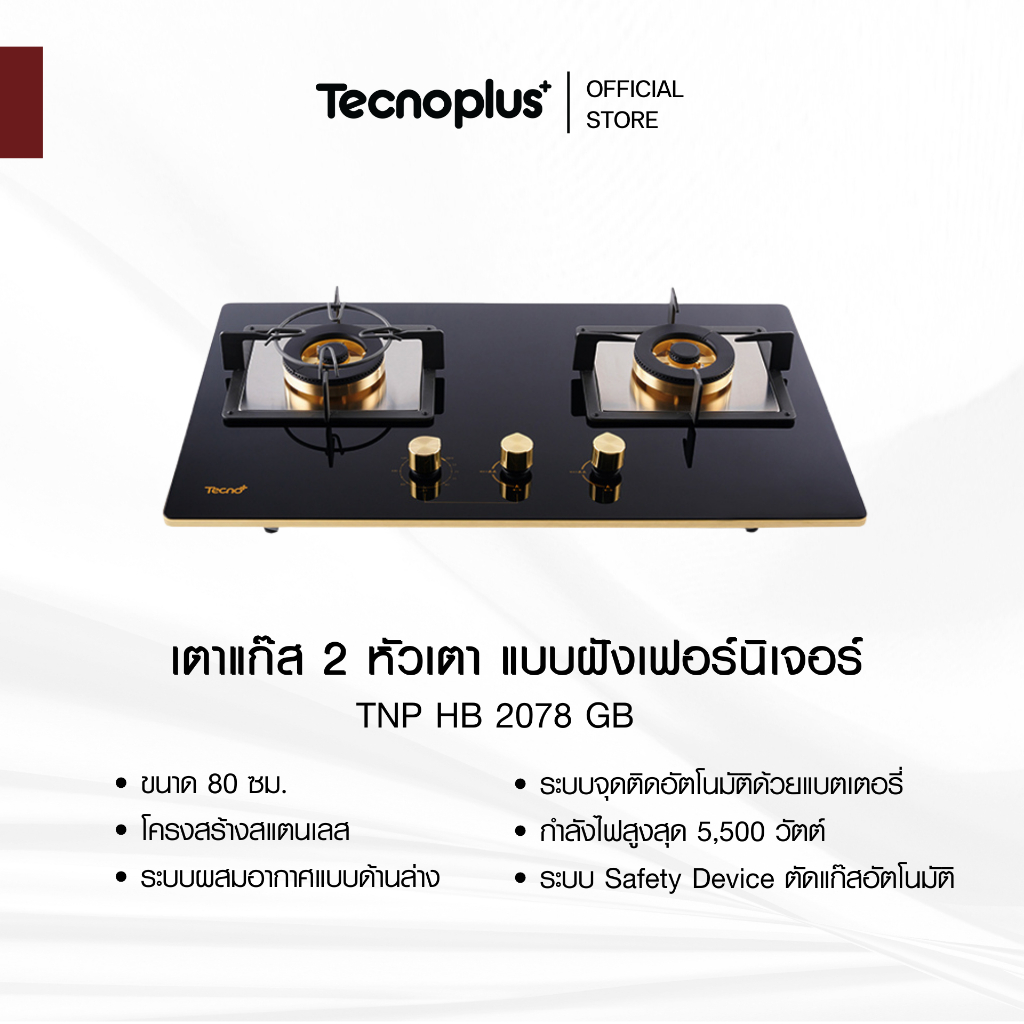 เตาแก๊ส 2 หัวเตา แบบฝังเฟอร์นิเจอร์ Tecnoplus รุ่น TNP HB 2078 GB ขนาด 80 ซม.