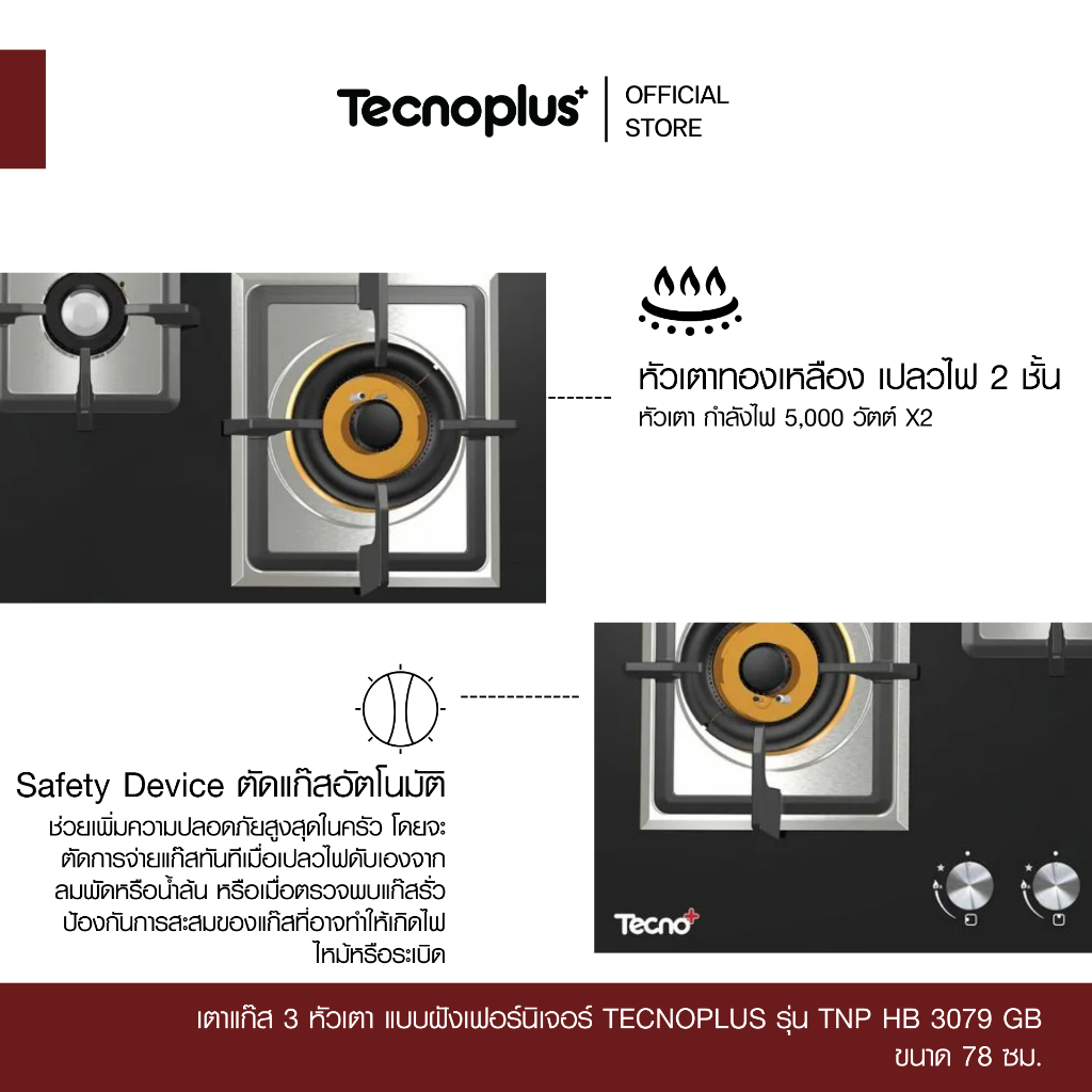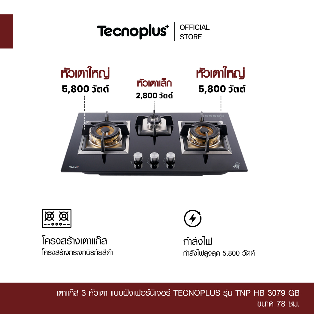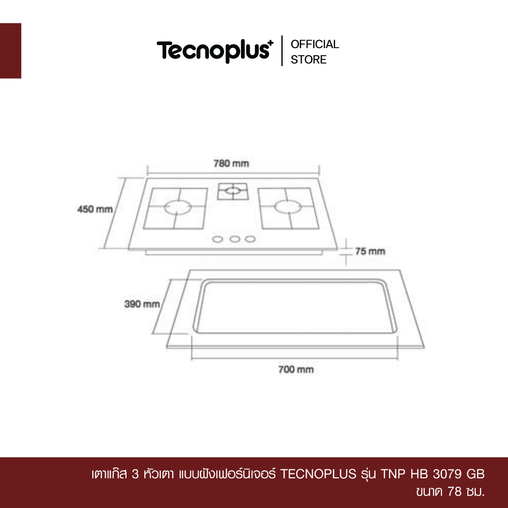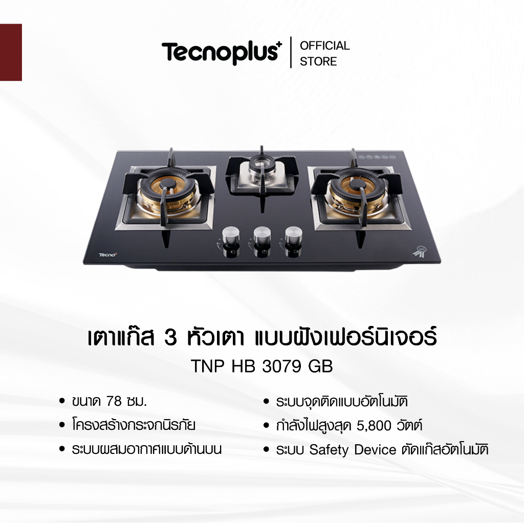 เตาแก๊ส 3 หัวเตา แบบฝังเฟอร์นิเจอร์ Tecnoplus รุ่น TNP HB 3079 GB ขนาด 78 ซ ม.
