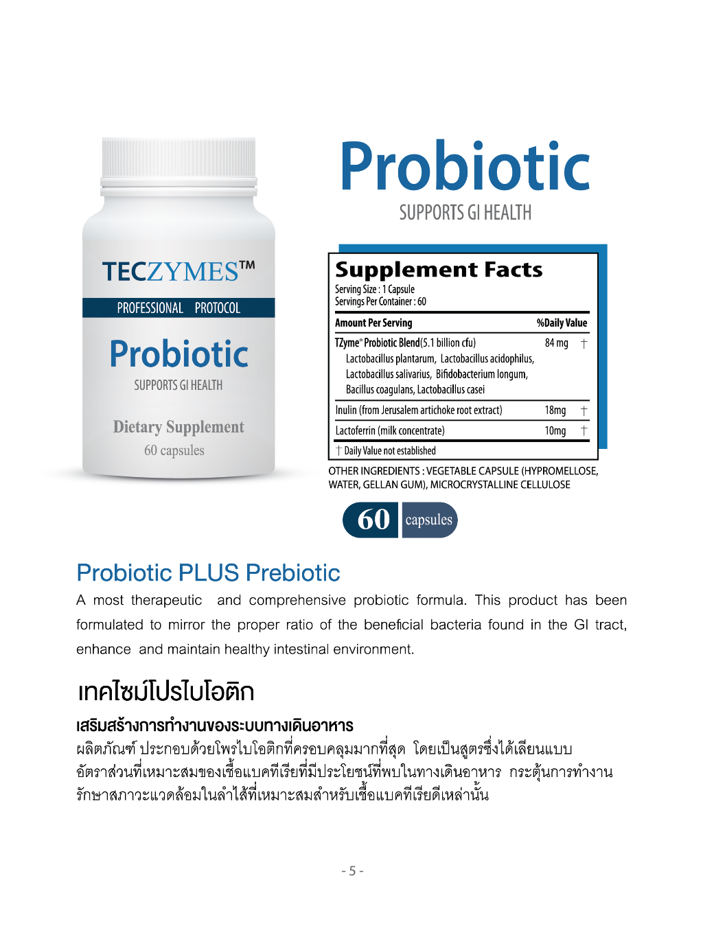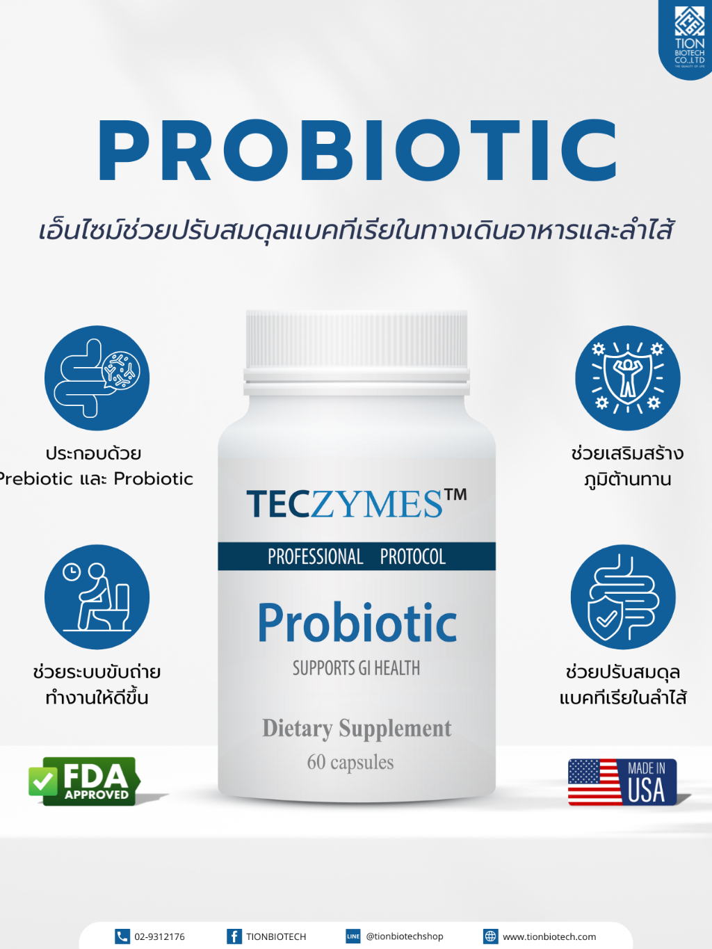 TECZYMES Probiotic เป็นพรีไบโอติกส์ ช่วยปรับสมดุลลำไส้ ลดอาการท้องผูก กรดไหลย้อน บรรจุ 60 แคปซูล