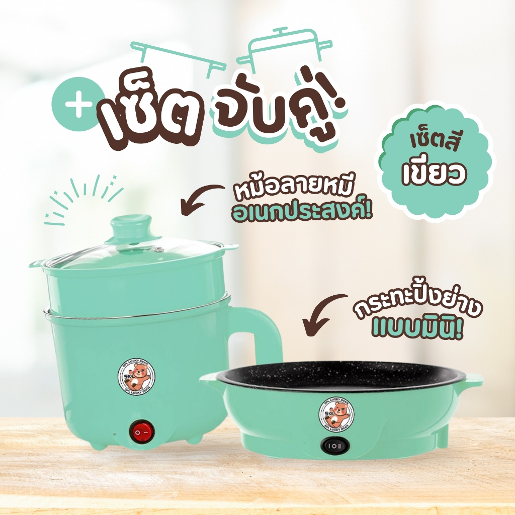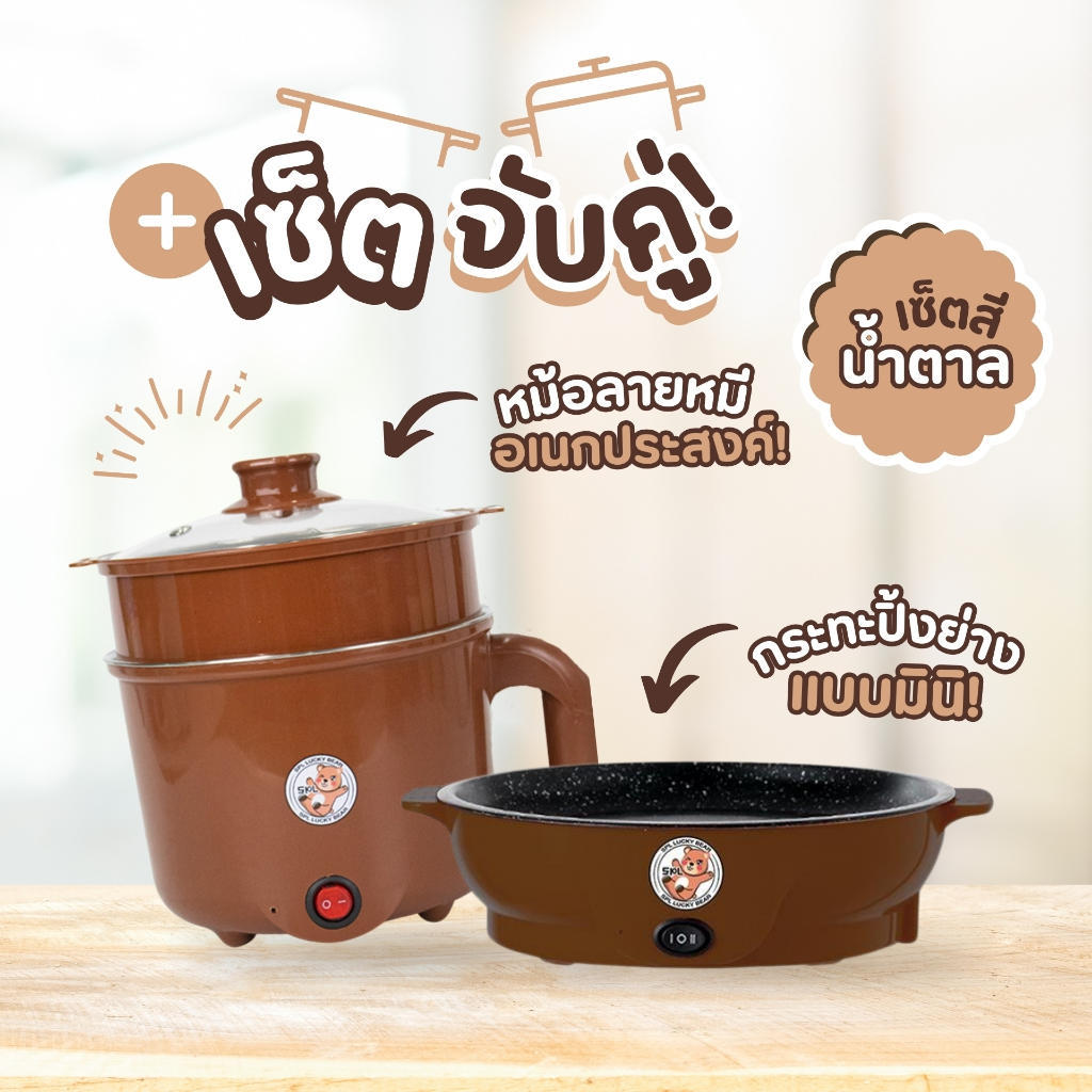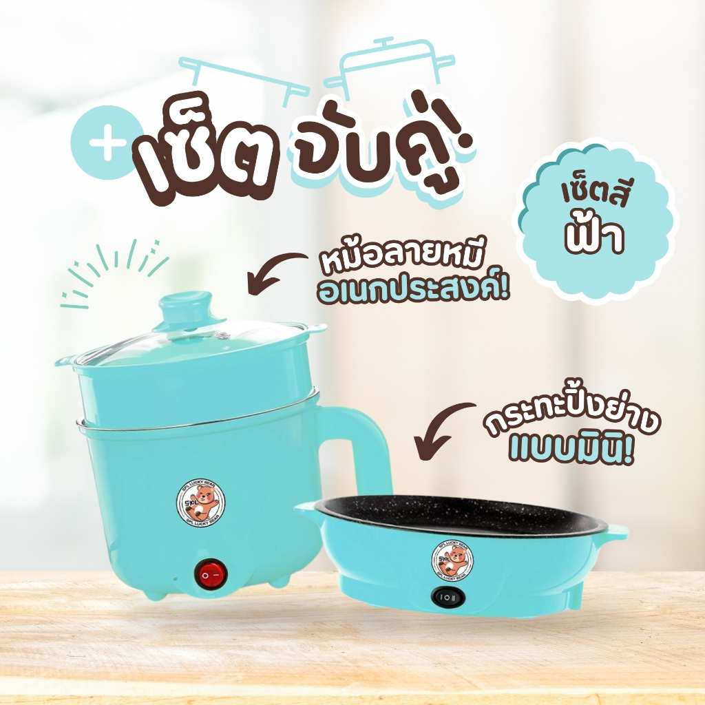 เซตคู่ หม้อ+กระทะ ลายหมี ได้2ชิ้น สแตนเลส หม้ออเนกประสงค์ กระทะมินิ เตาปิ้งย่างไฟฟ้า หม้อสุกี้ กระทะย่างเนย หม้อมาม่า