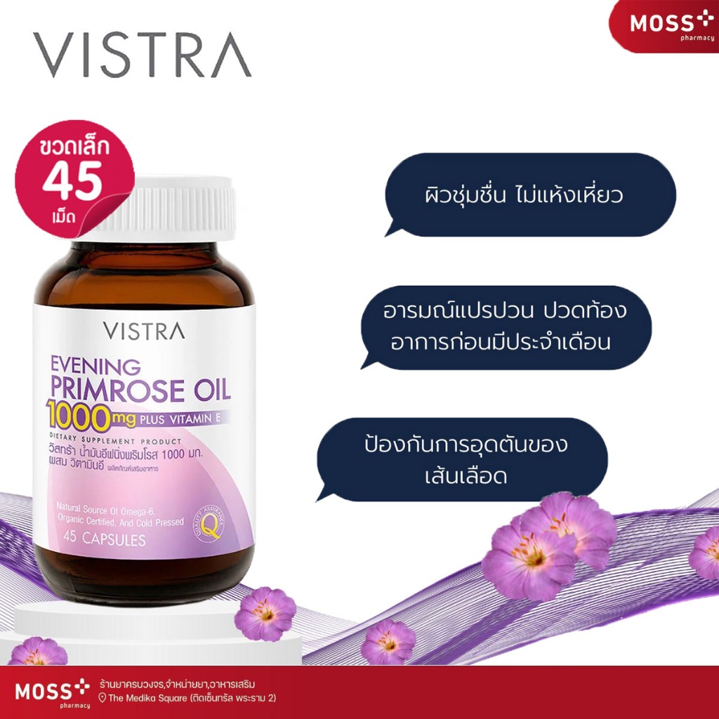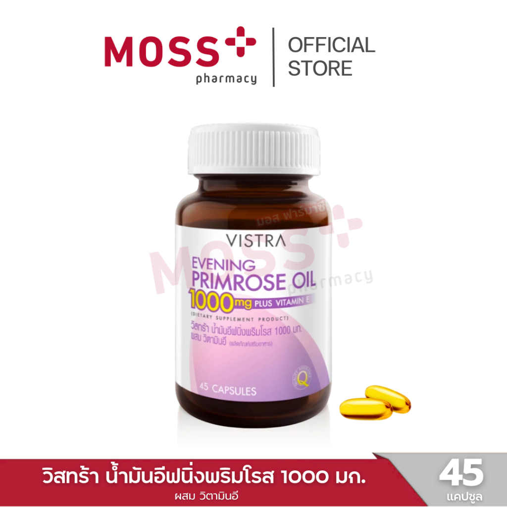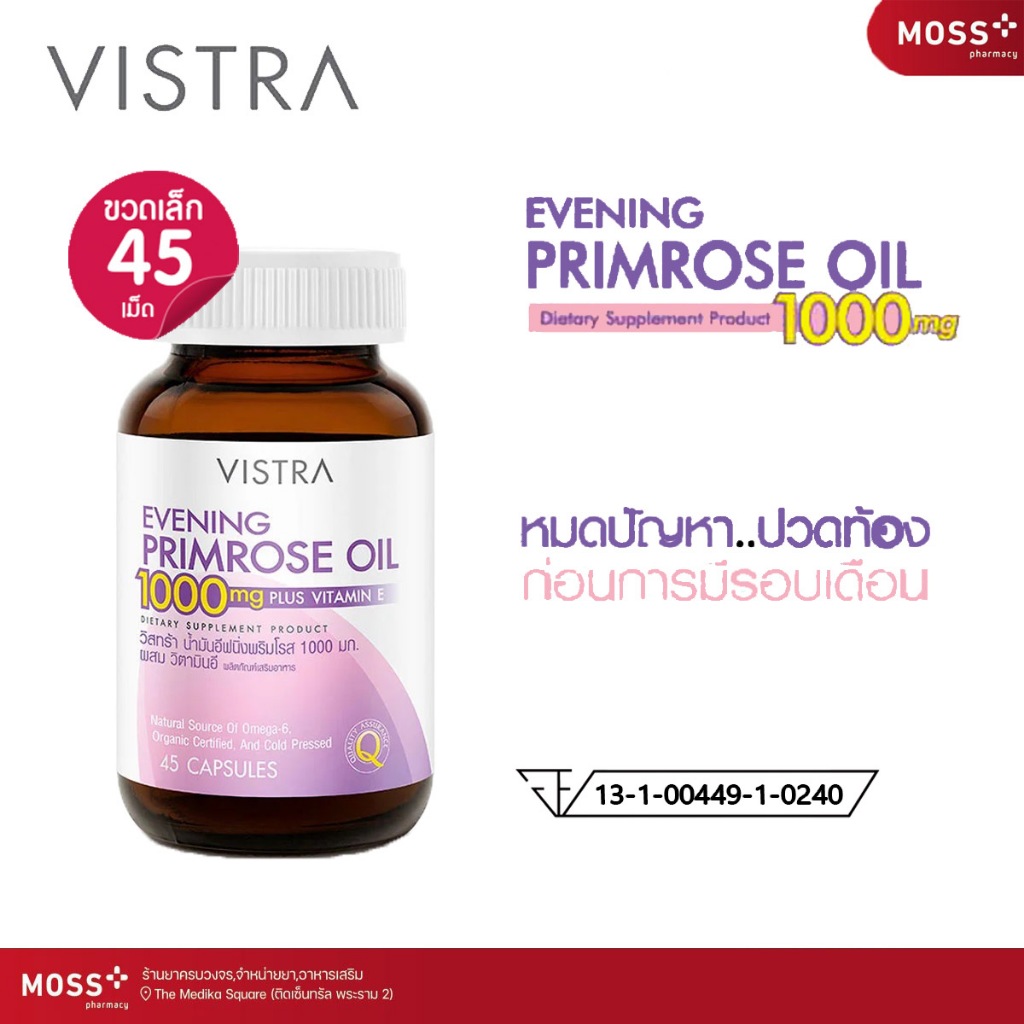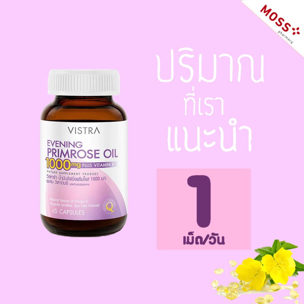 VISTRA Evening Primrose Oil 1000 mg (วิสทร้า น้ำมันอีฟนิ่งพริมโรส 1000 มก.) อีฟนิ่งพริมโรส บรรจุ 45 แคปซูล