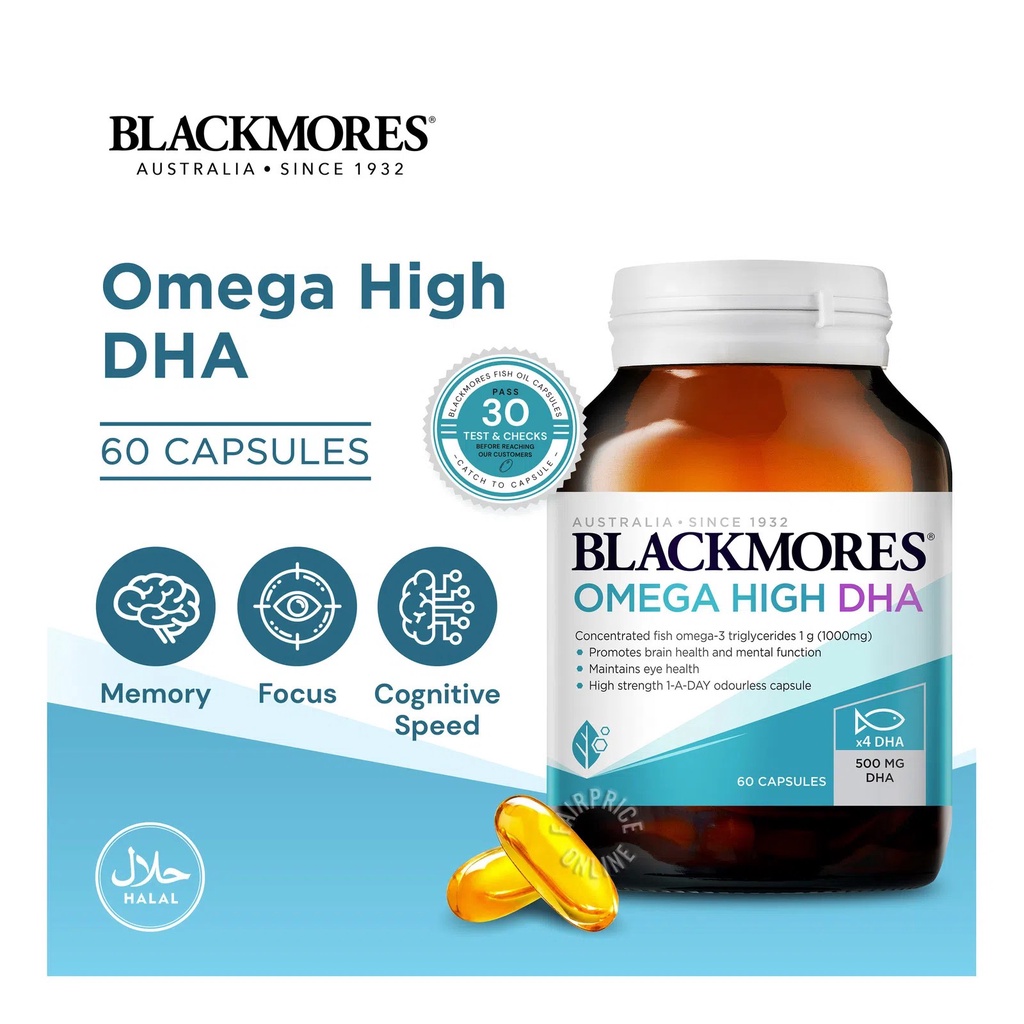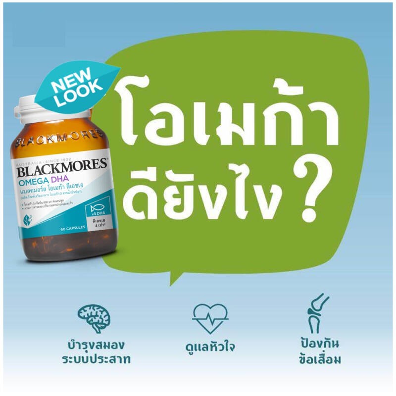 BLACKMORES OMEGA DHA แบลคมอร์ส โอเมก้า ดีเอชเอ packคู่ (น้ำมันปลาผสมวิตามิน อี) ขนาด 2x60S.รหัส7302 Exp.1/28