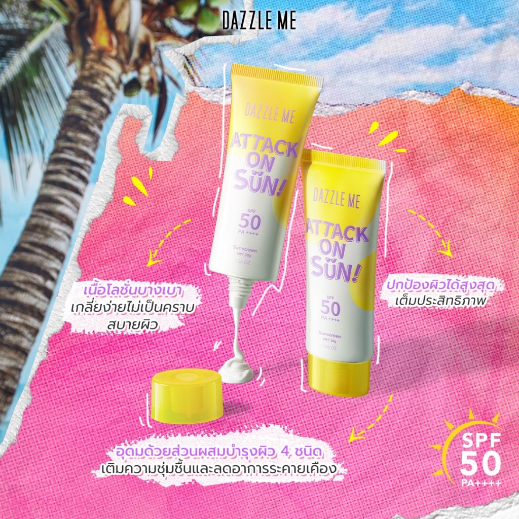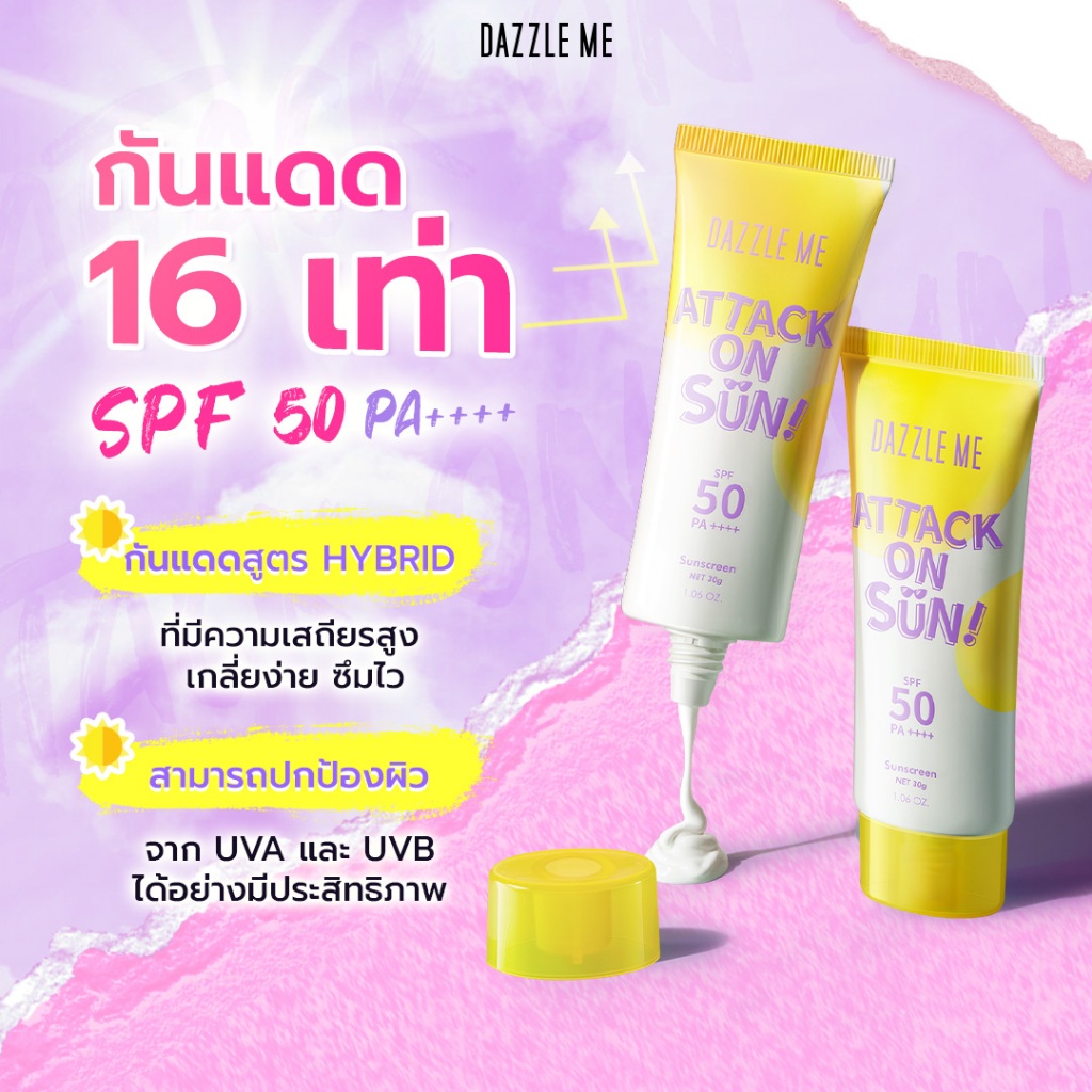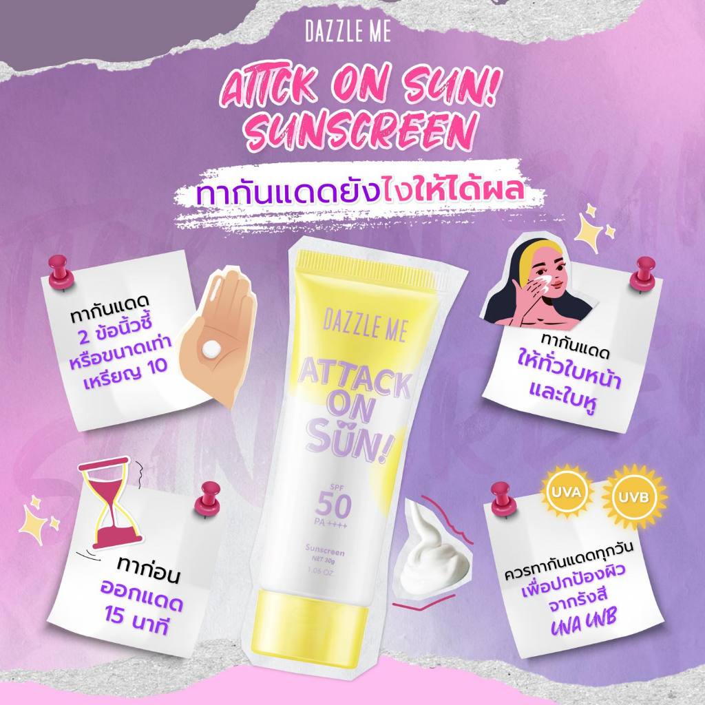 ถูก/แท้/มีไลฟ์ กันแดด Dazzle Me Attack on Sun Sunscreen SPF50PA++++ กันแดดทาหน้า เนื้อครีม เนื้อเจล ปกป้องผิว เบาสบายผิว
