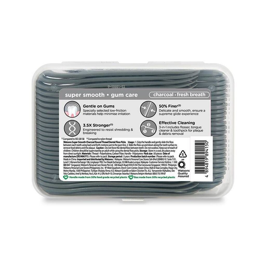 Watsons วัตสัน ซุปเปอร์ สมูธ ไหมขัดฟันเส้นกลม ชาร์โคล ชนิดด้าม 50 ด้าม แพ็ค 3 กล่อง
