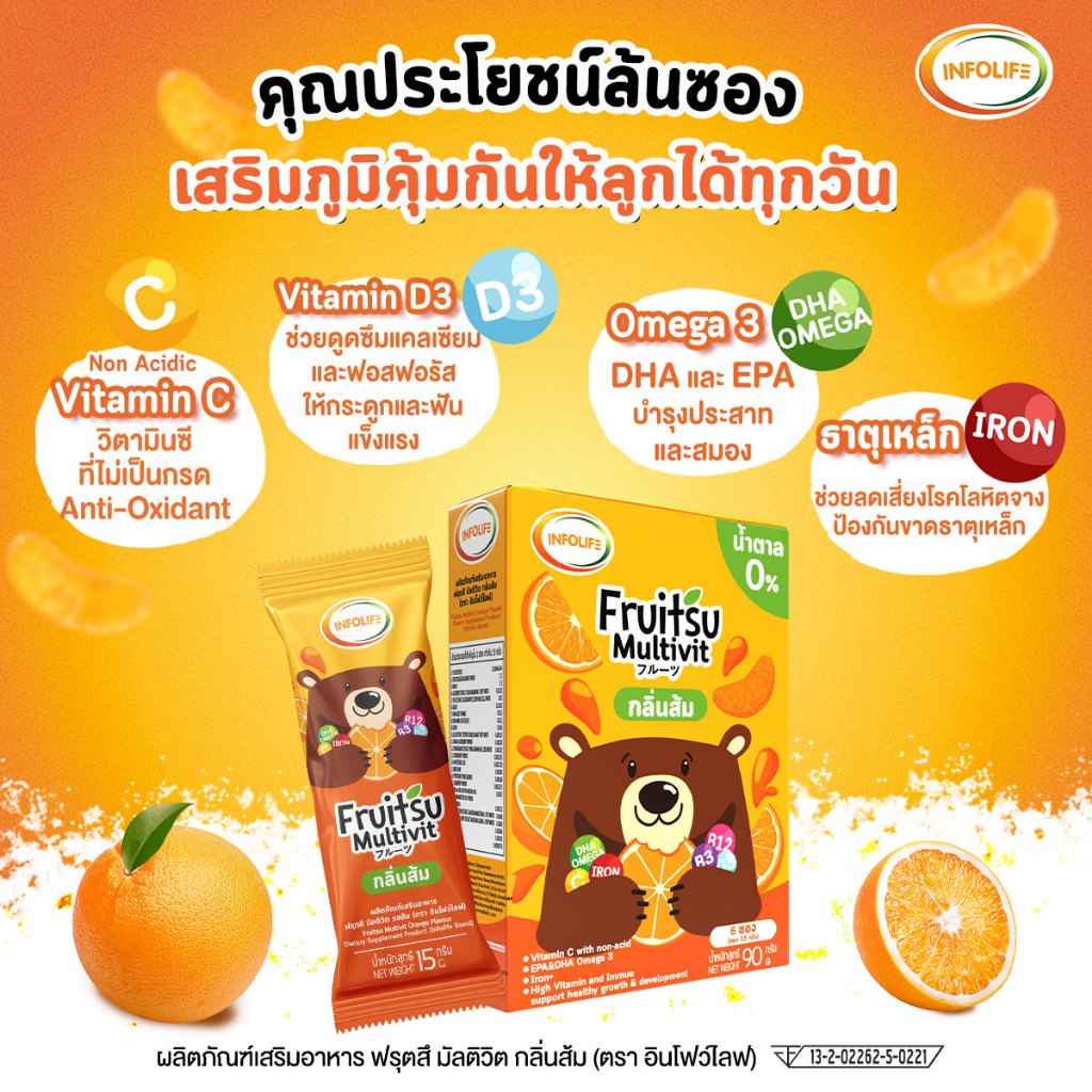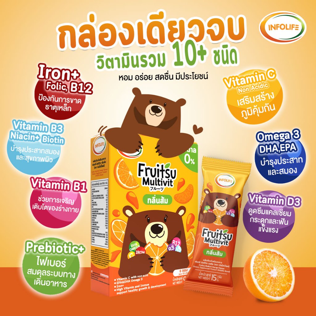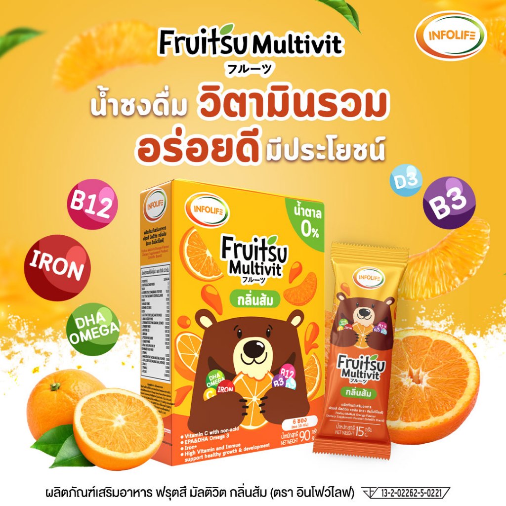 (ยกลัง 12 กล่องเล็ก/72ซอง) อินโฟว์ไลฟ ฟรุตสึมัลติวิต วิตามินรวม ชงดื่ม เสริมธาตุเหล็กและบำรุงสมอง รสส้ม สำหรับเด็ก ส่งฟรี