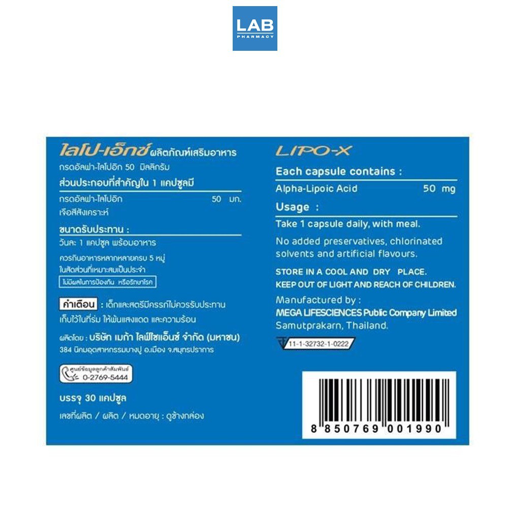 MEGA We Care Lipo-X 50 mg. 30 Caps - ไลโป-เอ็กซ์ ต้านอนุมูลอิสระ ควบคุมระดับน้ำตาลในเลือด