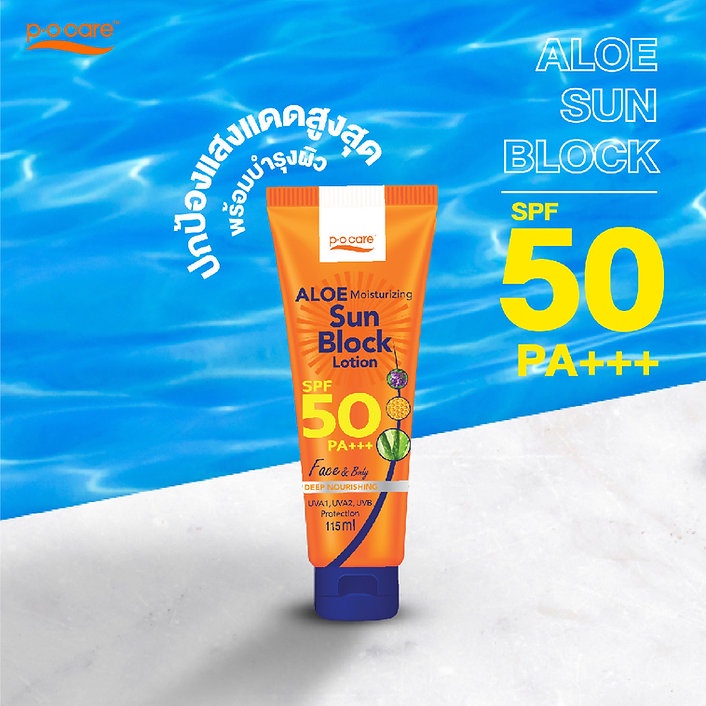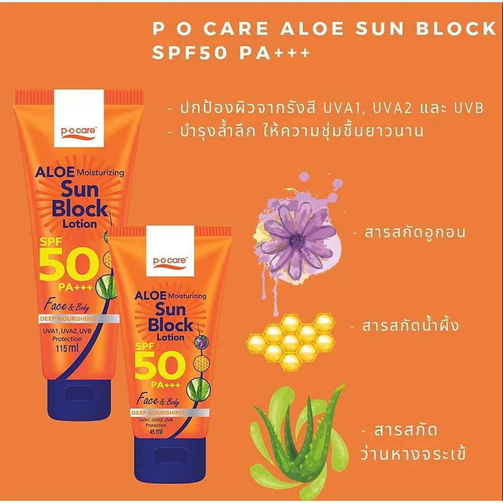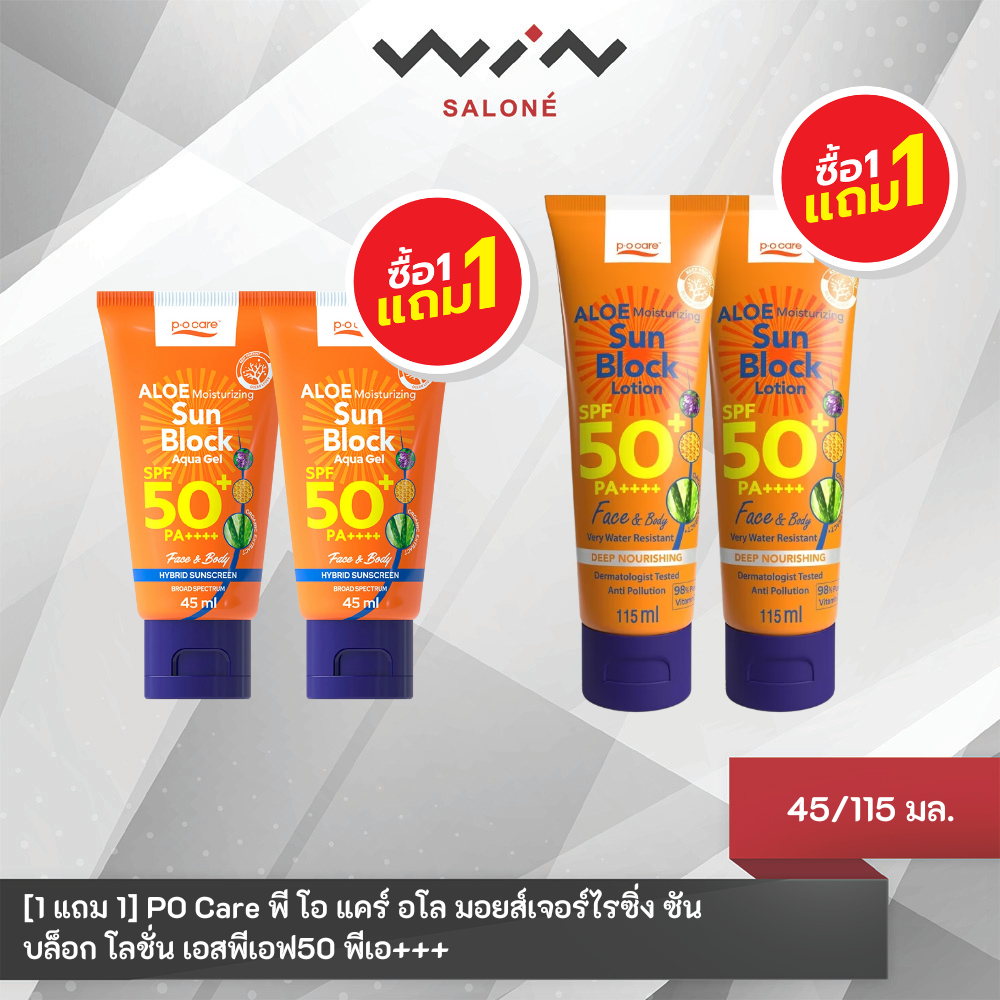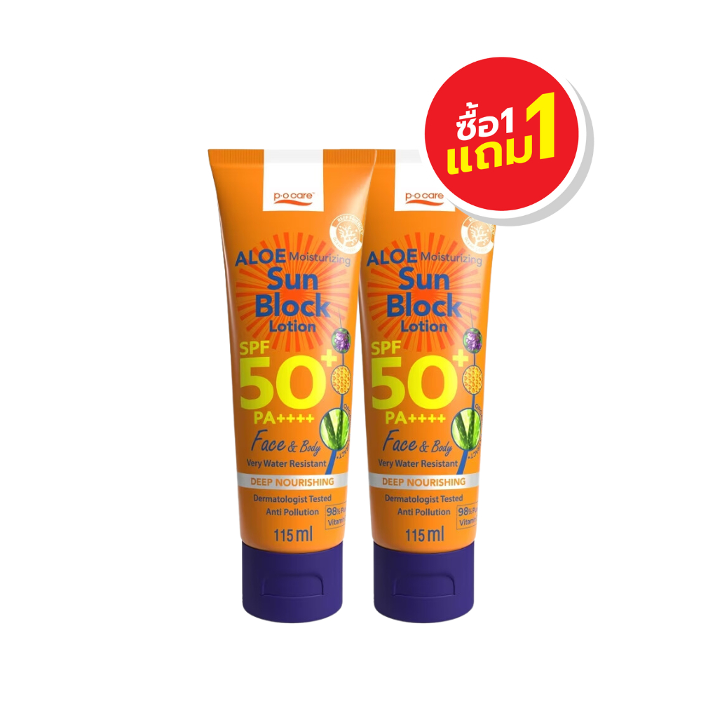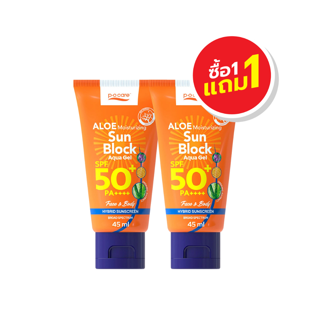 [1 แถม 1] PO Care พี โอ แคร์ อโล มอยส์เจอร์ไรซิ่ง ซัน บล็อก โลชั่น เอสพีเอฟ50 พีเอ+++ 45/115 มล.