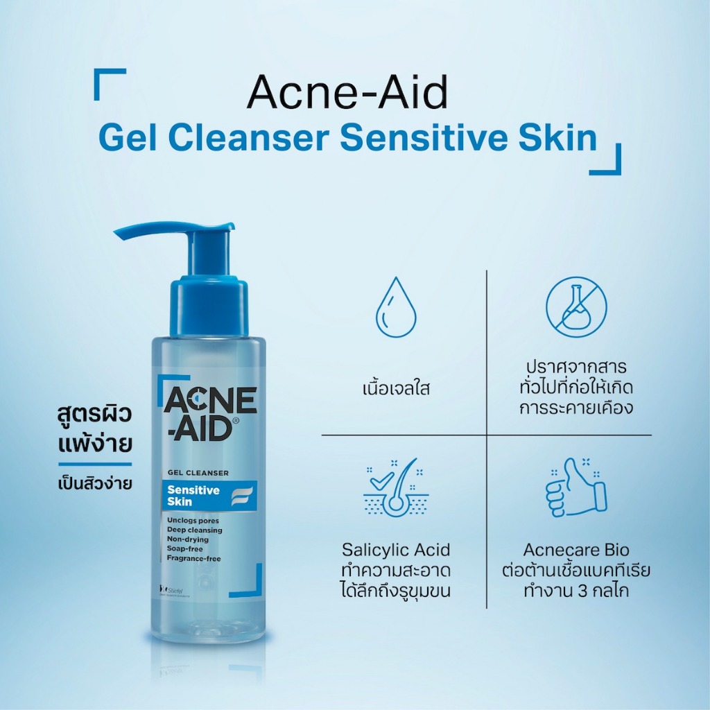 Acne Aid Sensitive Skin Cleanser Gel 100ml คลีนเซอร์ ทำความสะอาดผิว รักษาสิว คุมความมัน เจลใสอ่อนโยน คลีนผิวแพ้ง่าย