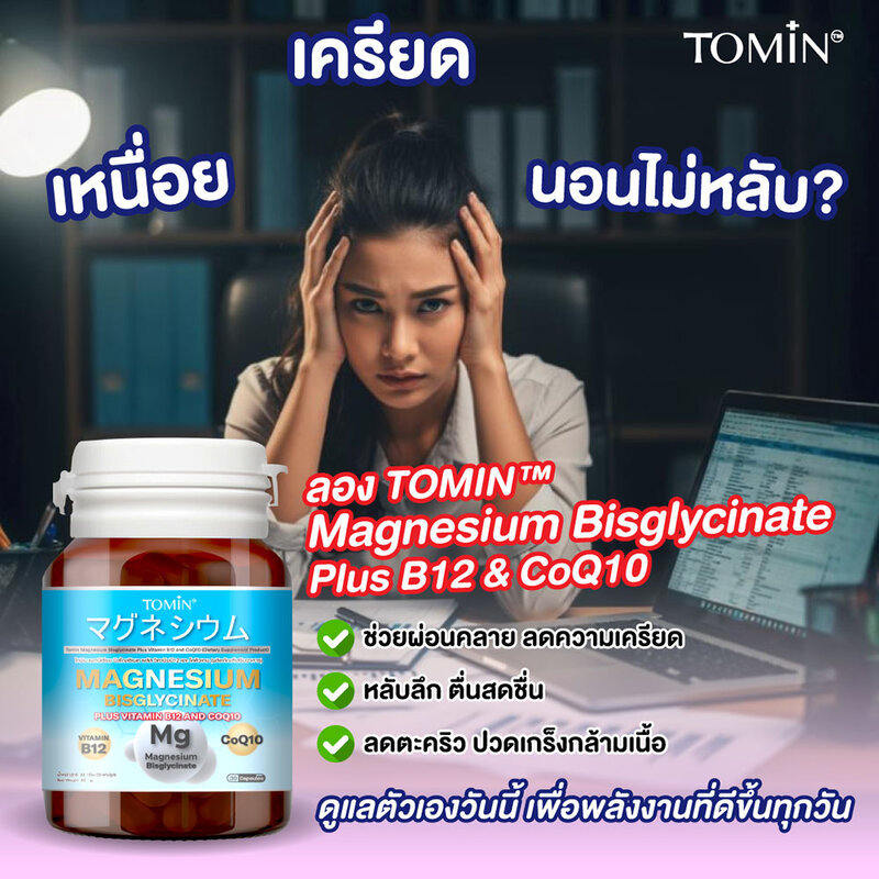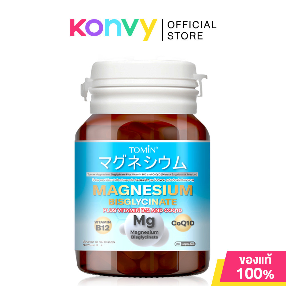 Tomin Magnesium Bisglycinate Plus Vitamin B12 And CoQ10 30 Capsules โทมิน ผลิตภัณฑ์เสริมอาหาร.