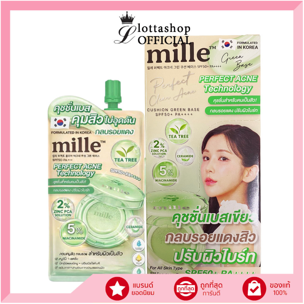 🔥แท้/ดีลสุดคุ้ม/ไลฟ์ทุกวัน🔥(กล่องx6ซอง) MILLE PERFECT CLEAR ACNE CUSHION GREEN BASE SPF 50+ PA+++ 6 g. #คุชชั่นเบสเขียว
