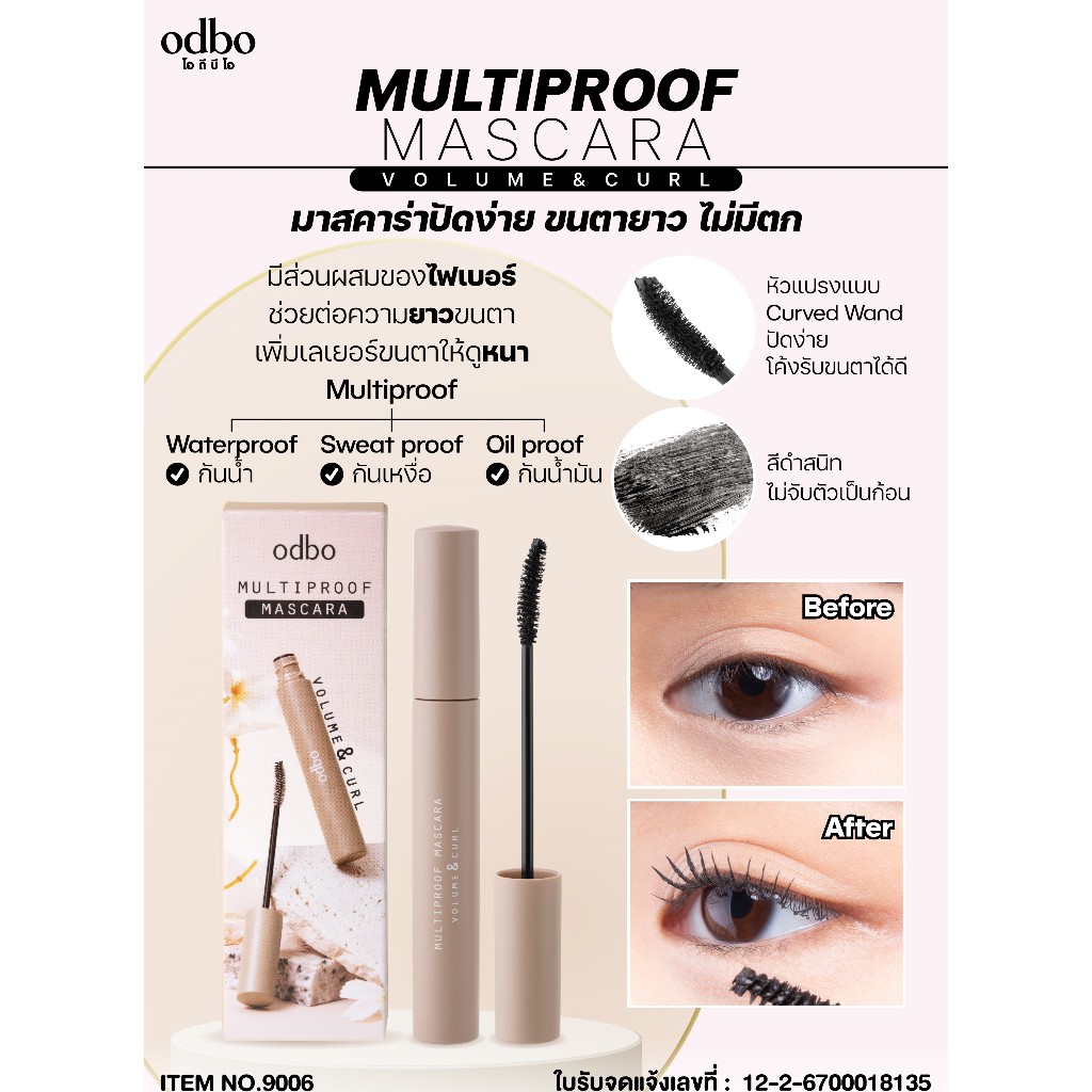 ถูก/แท้/มีไลฟ์ มาสคาร่า ODBO Multiproof Mascara Volume&Curl ปัดขนตา ขนตาเด้ง ขนตายาว ขนตางอน กันน้ำ ติดทน