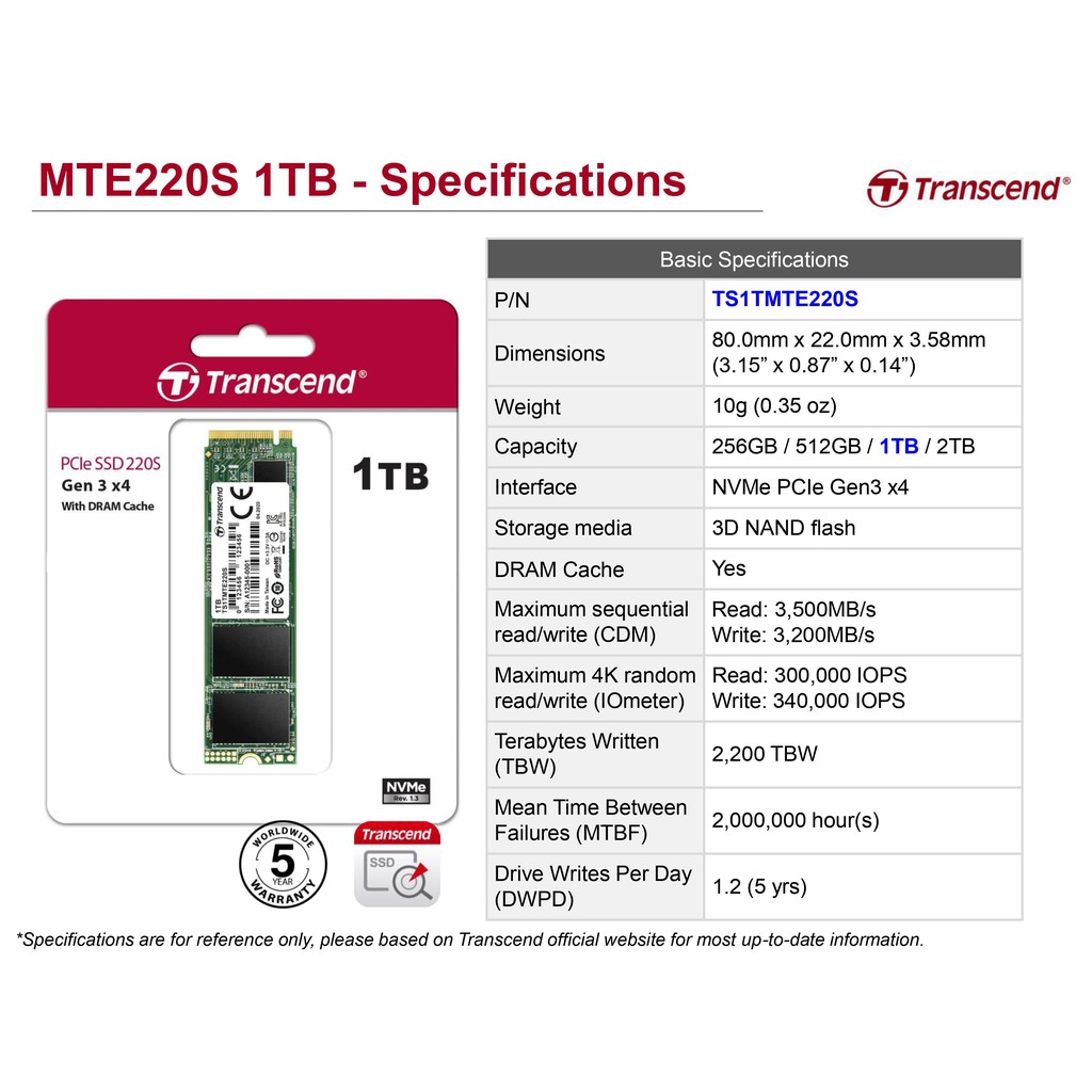 Transcend PCIe NVMe M.2 SSD 1TB:MTE220S: รับประกัน 5 ปี หรือ **รับประกันไม่เกิน 2,200 TBW**- มีใบกำกับภาษี-TS1TMTE220S