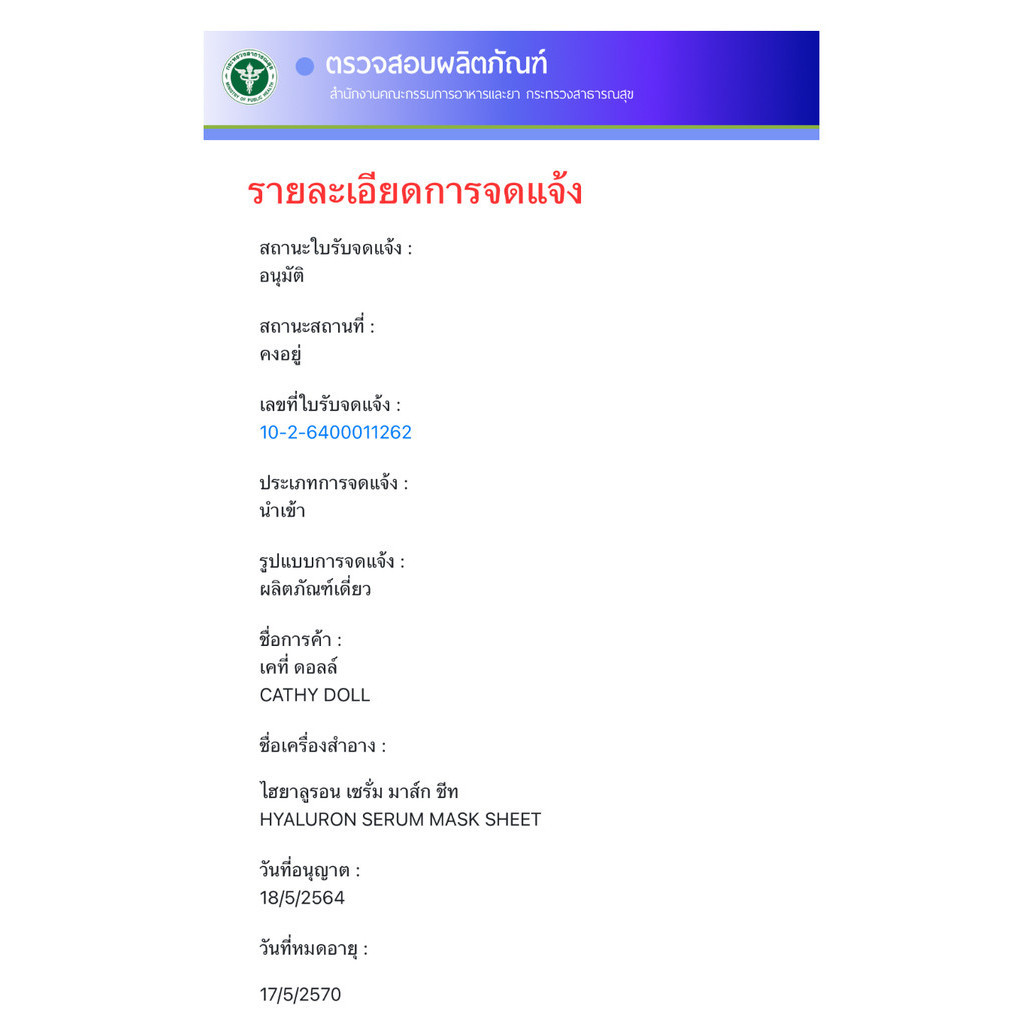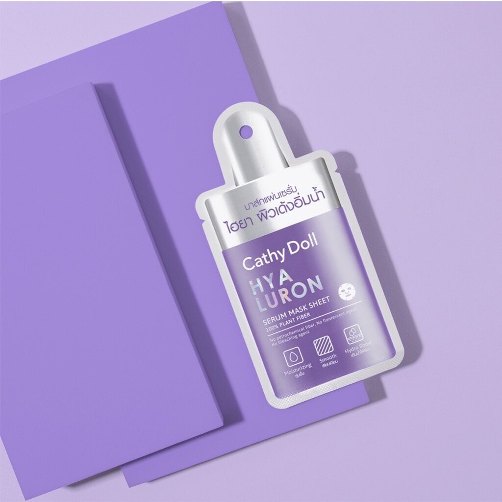(6แผ่น/กล่อง) Cathy Doll Hyaluron Serum Mask Sheet 20g แผ่นมาสก์หน้า สูตร เซรั่มไฮยา