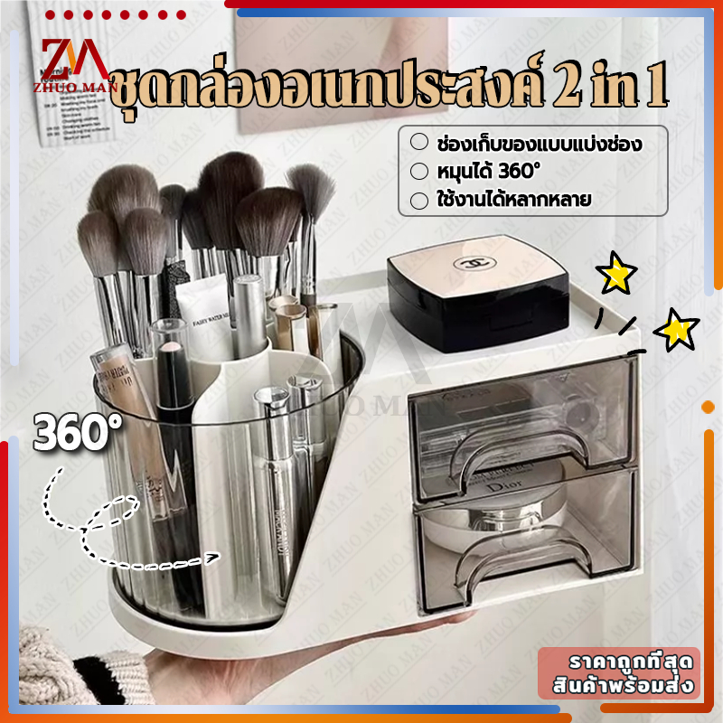 ชุดกล่องอเนกประสงค์ 2 in 1กล่องเก็บเครื่องสำอาง ที่จัดเก็บปากกาหมุนได้ กล่องเก็บของแบบลิ้นชัก หมุนได้ มีลิ้นชัก 2 ชั้น