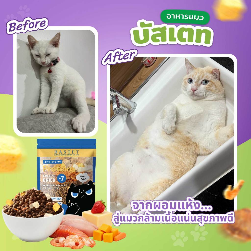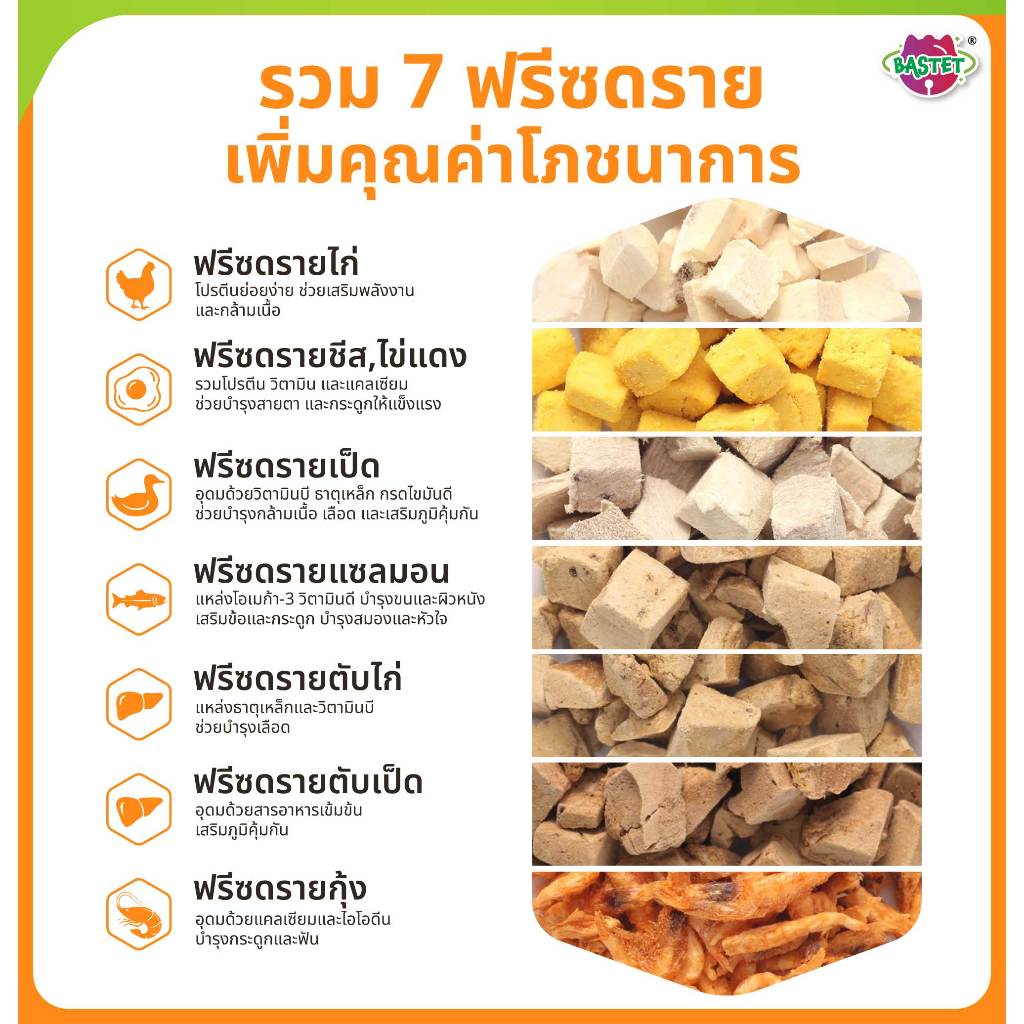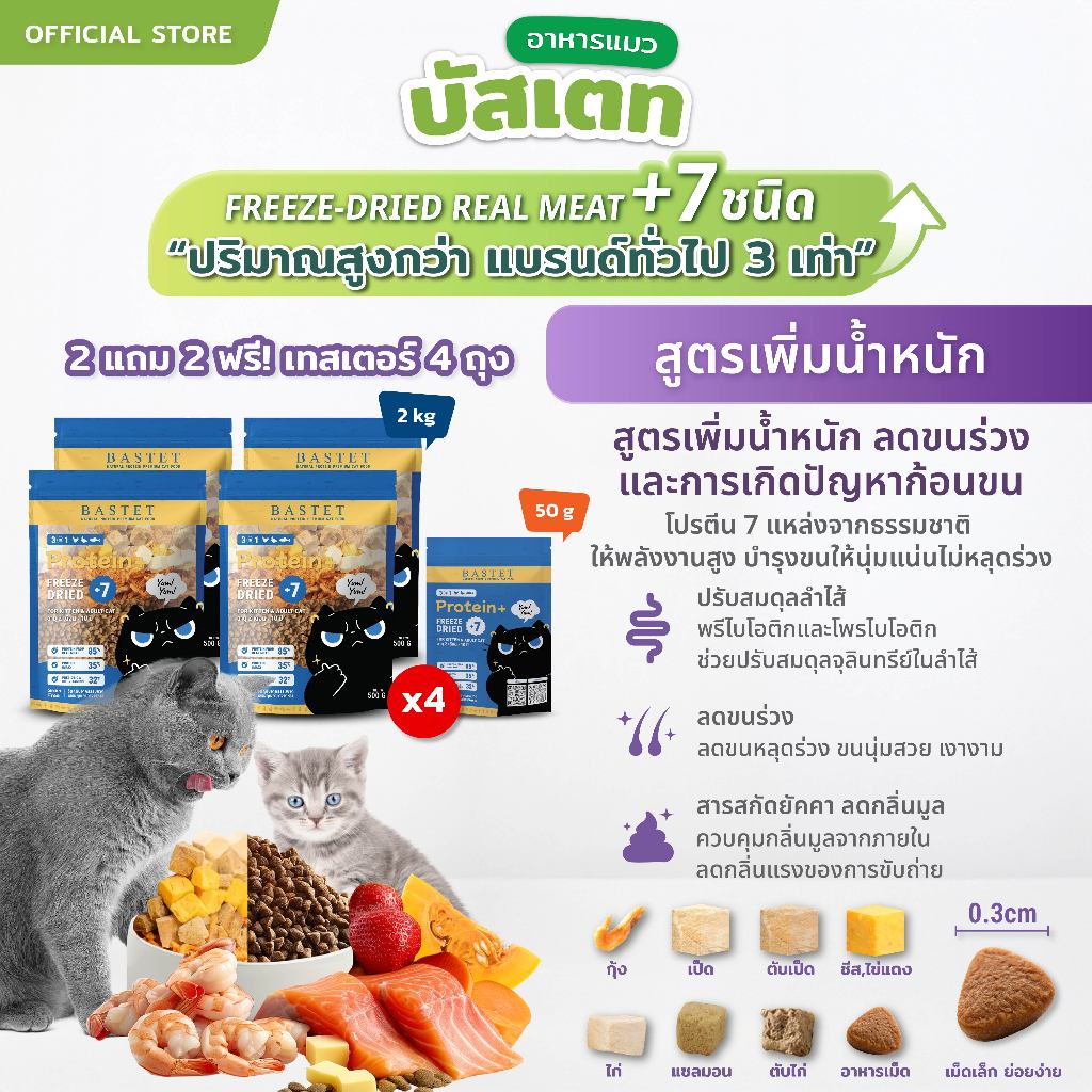BASTET อาหารเเมวผสมฟรีซดราย7ชนิด 4 ถุง (2 kg) (แมวท้องแมวเด็กกินได้)ขนสวย/ย่อยง่าย/แมวกินเกลี้ยงถุง