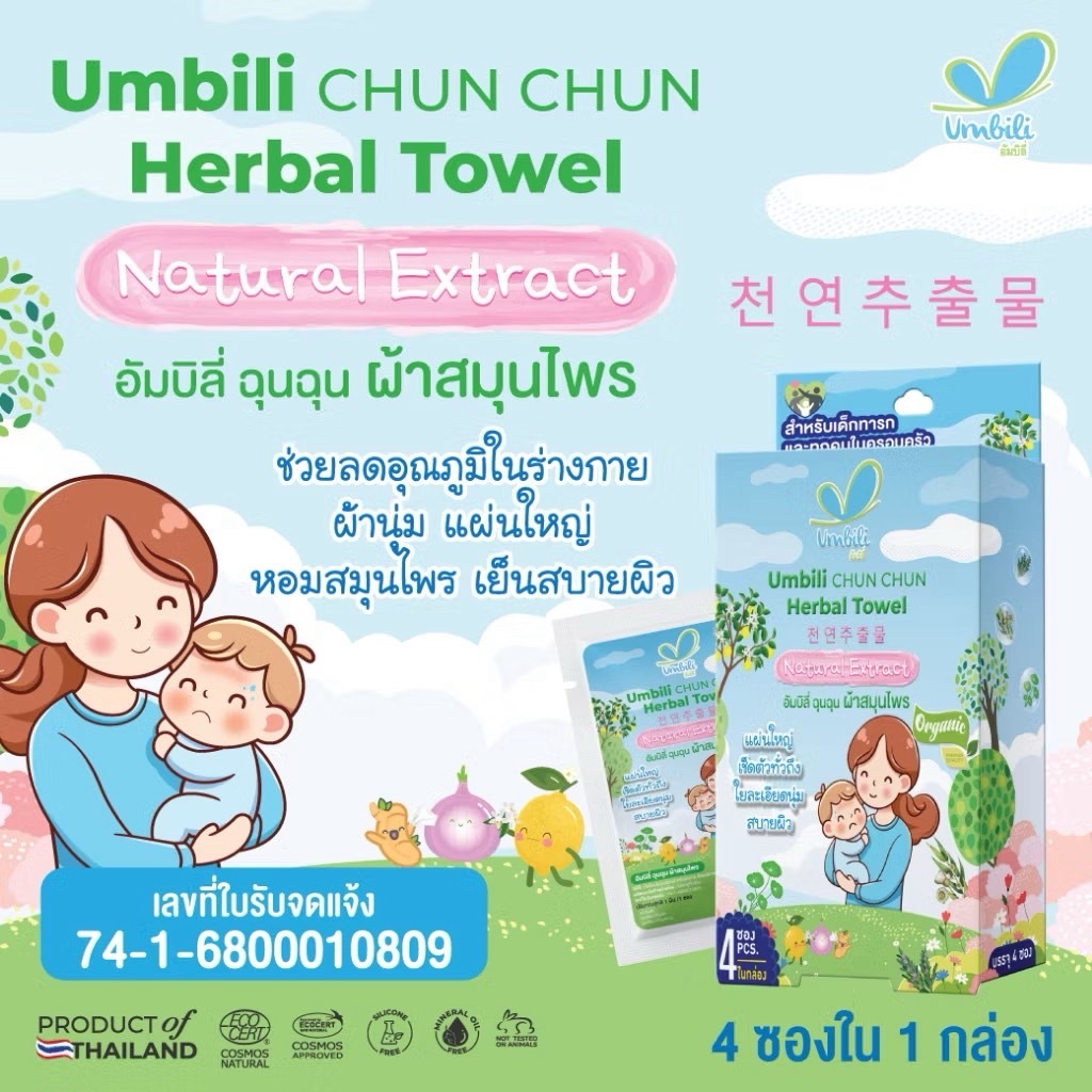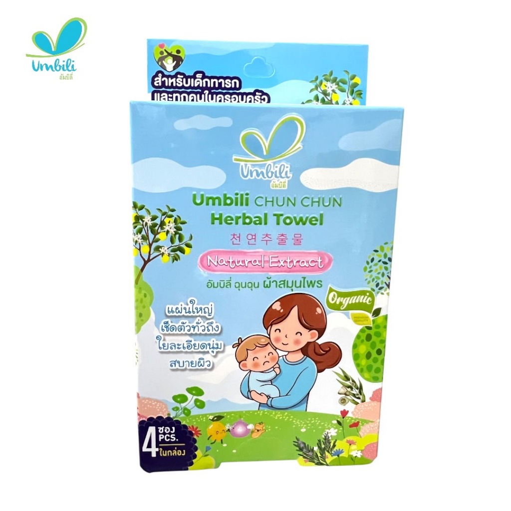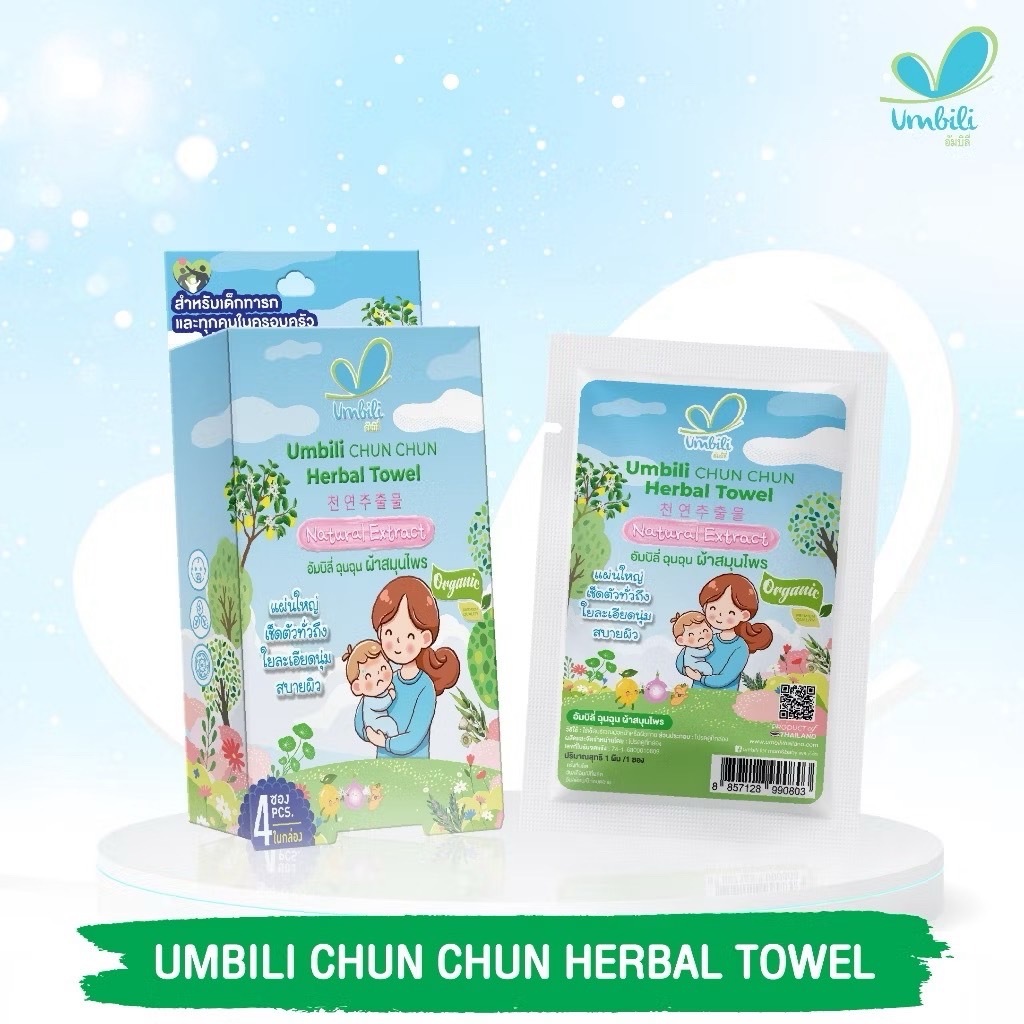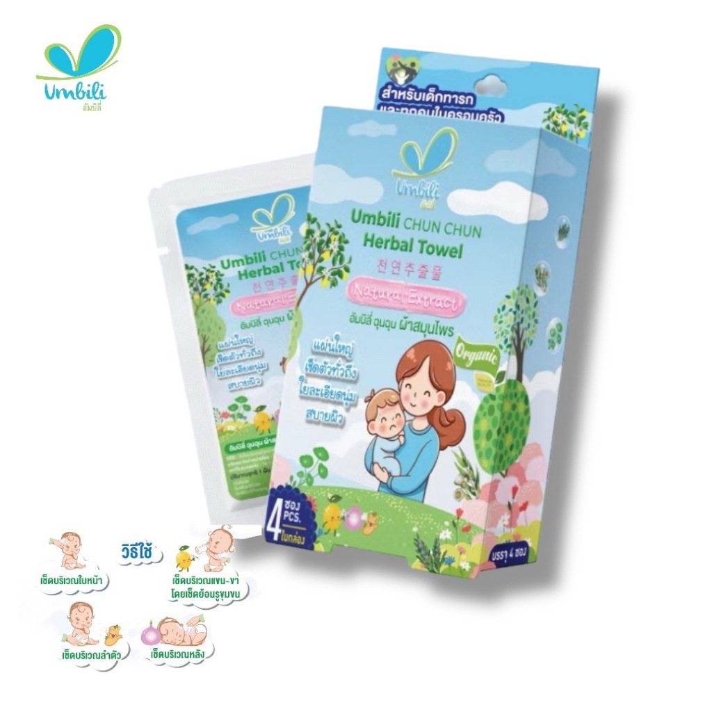 Umbili ฉุนฉุน ผ้าเปียกสมุนไพรลดไข้ เช็ดหน้า เช็ดตัวได้ อัมบิลี่ 1 กล่อง (4 ซอง)