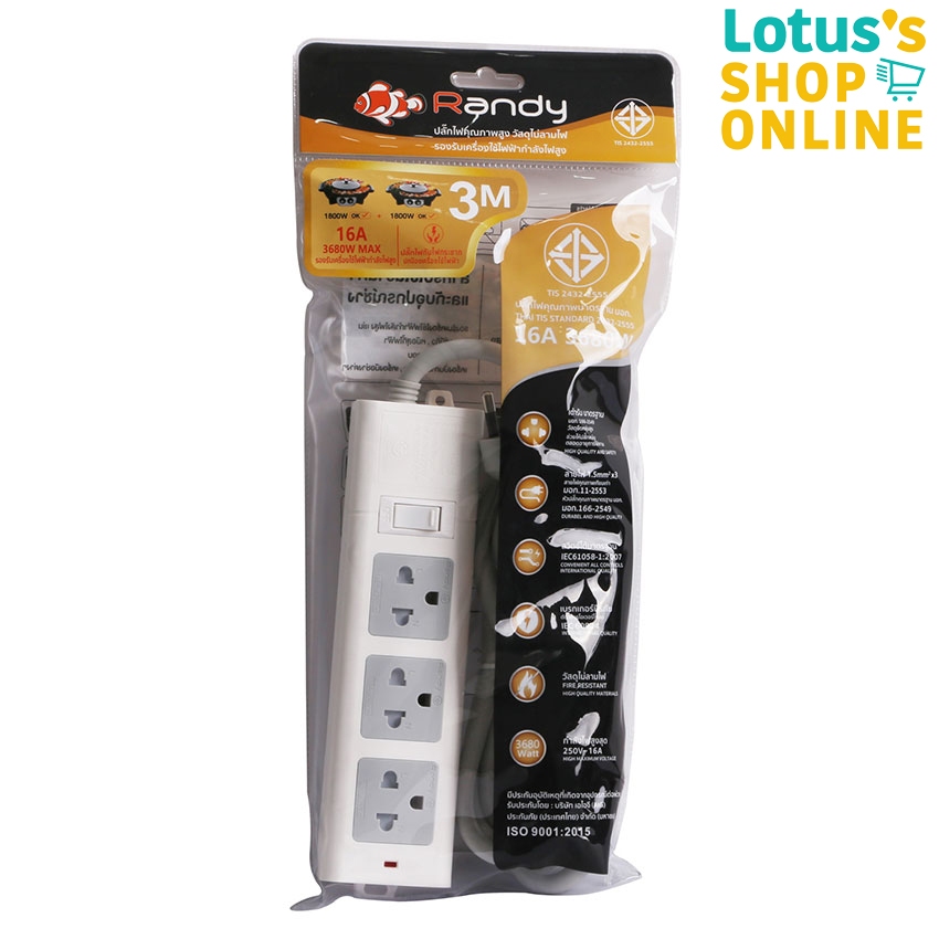 แรนดี้ ปลั๊ก พ่วงสี 3 ช่อง 1 สวิทช์ 16 แอมป์ ยาว 3 เมตร RANDY PLUG 3 SOCKET 1 SWITCH 16 A 3 M