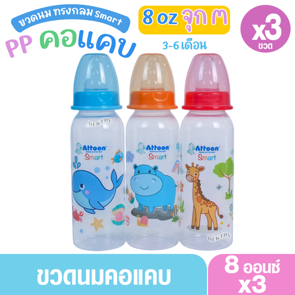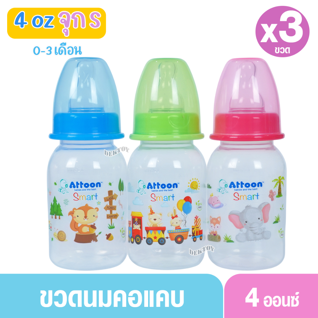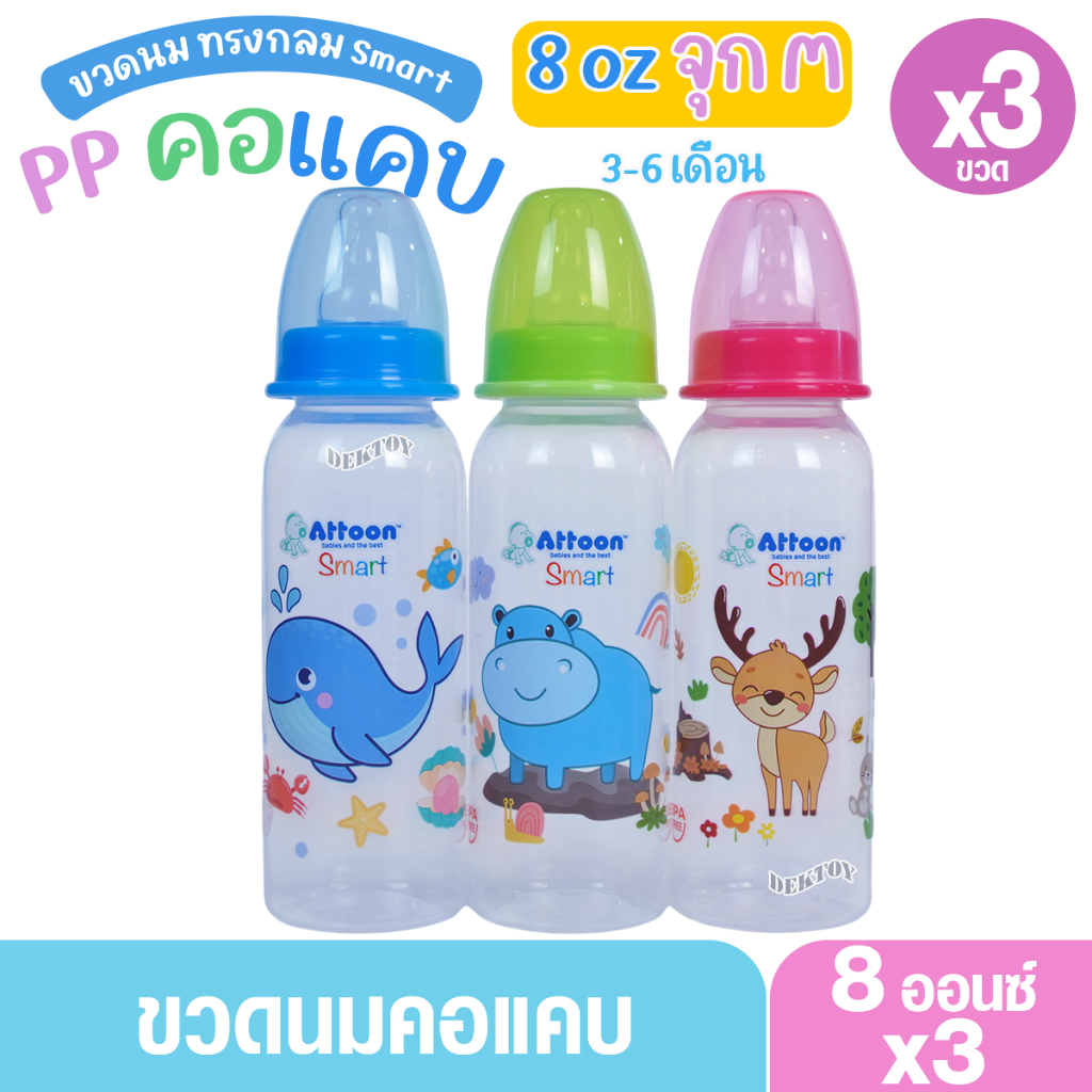 Attoon แอทตูน ขวดนมแอทตูน ทรงกลม คอแคบ smart 4และ8ออนซ์ แพ็ค3และแพ็ค6ขวด