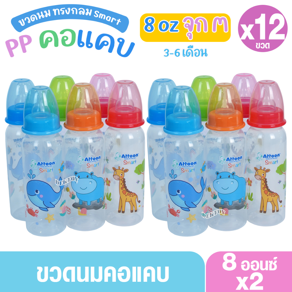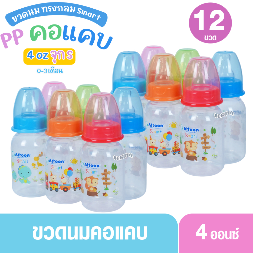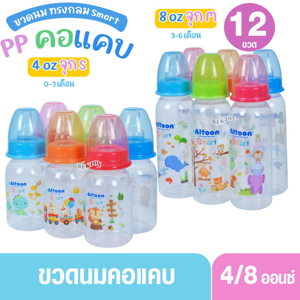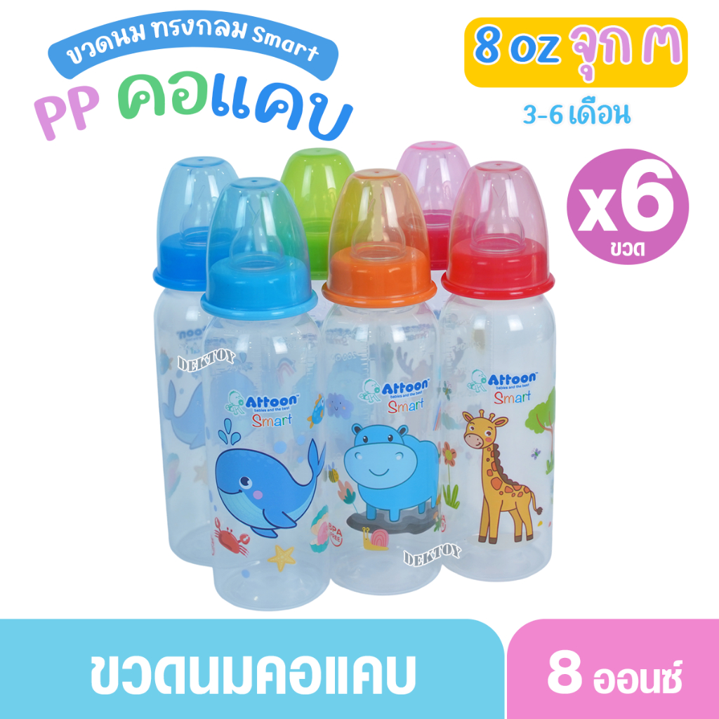 Attoon แอทตูน ขวดนมแอทตูน ทรงกลม คอแคบ smart 4และ8ออนซ์ แพ็ค3และแพ็ค6ขวด